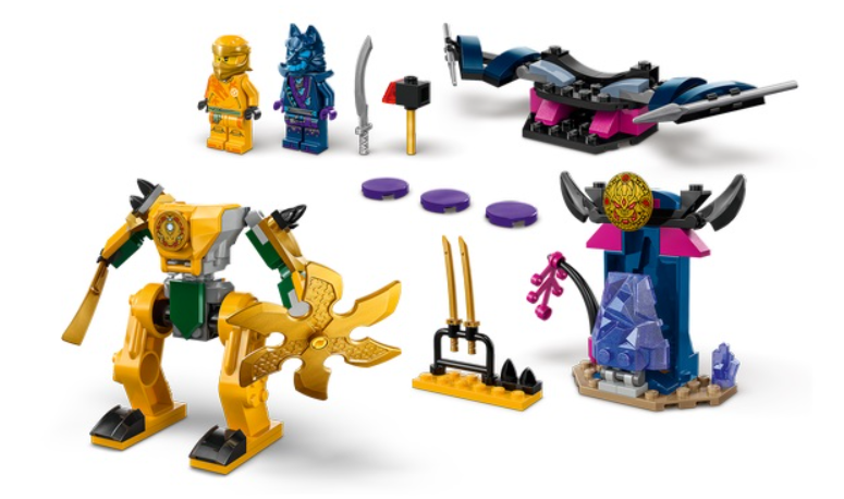 В этот набор LEGO NINJAGO входит минифигурка Арина NINJAGO с игрушечным мечом-катаной и воин в маске волка с аксессуаром-мечом. Арин вписывается в подвижную фигурку робота, который владеет большим мечом и вращающимся лезвием, а Воин в Маске Волка может летать на планере с подвижными крыльями, дисковым шутером и двумя копьями. Также есть построенная из кирпича хрустальная пещера с волшебным молотком внутри и оружейная стойка с двумя золотыми аксессуарами для мечей катана. Эта игрушка-ниндзя для детей была создана, чтобы доставить удовольствие детям, которые открывают для себя радость конструирования из кубиков LEGO.