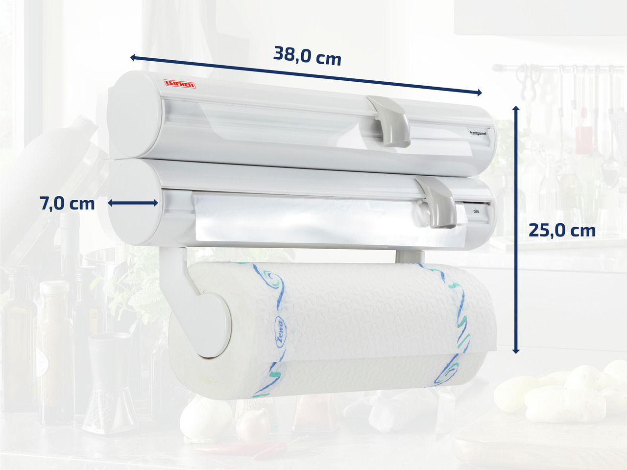 Крепящийся к стене держатель для различных рулонов. Конец фольги всегда под рукой. Отрезает плёнку там, где необходимо. Верхний держатель рулона снимается, чтобы можно было удобней и разнообразней пользоваться. Подходит для всех видов доступных в продаже кухонных рулонов. Простая установка (принадлежности для установки включены в комплект). Рулоны пищевой пленки и фольги не включены.