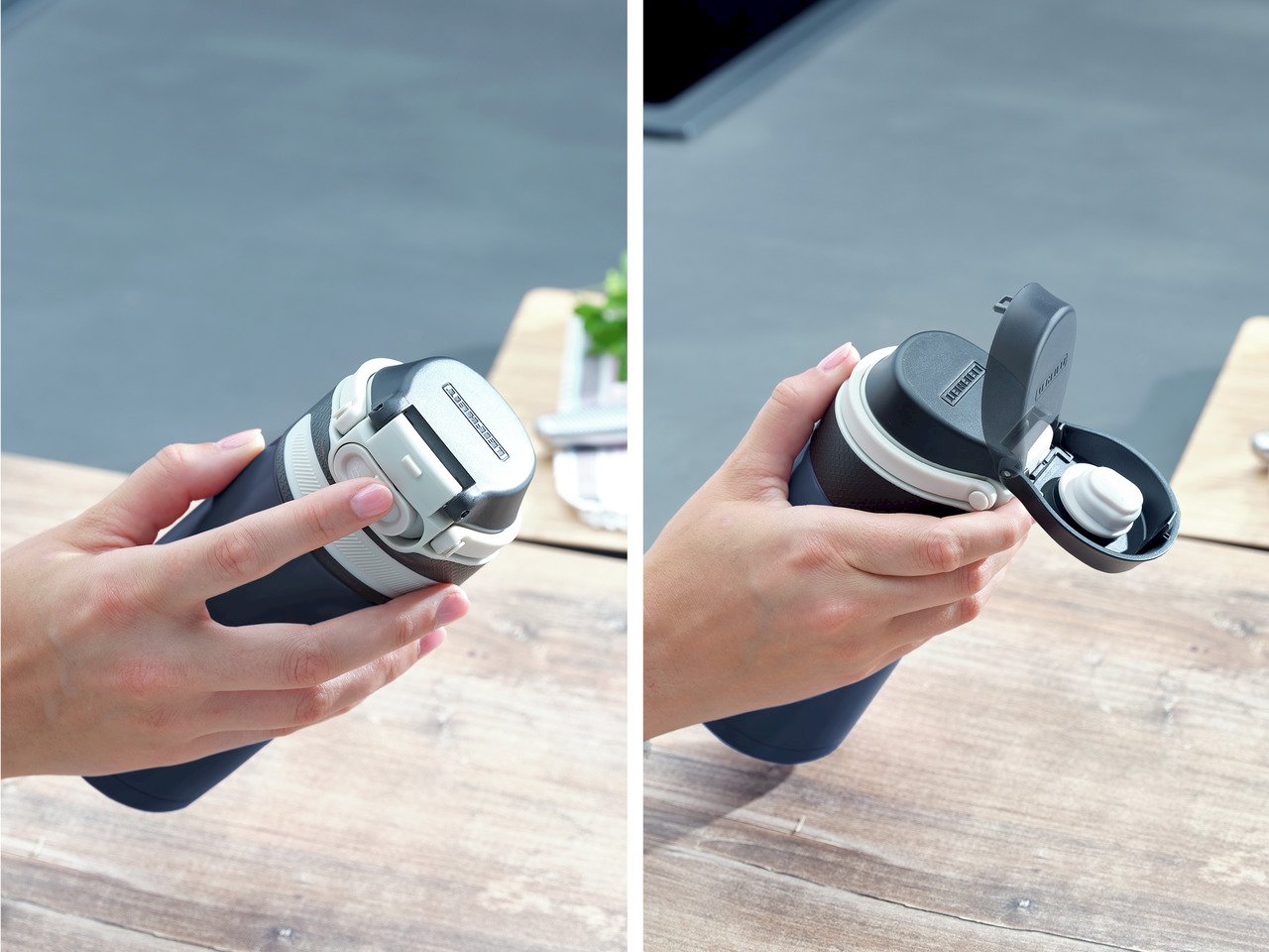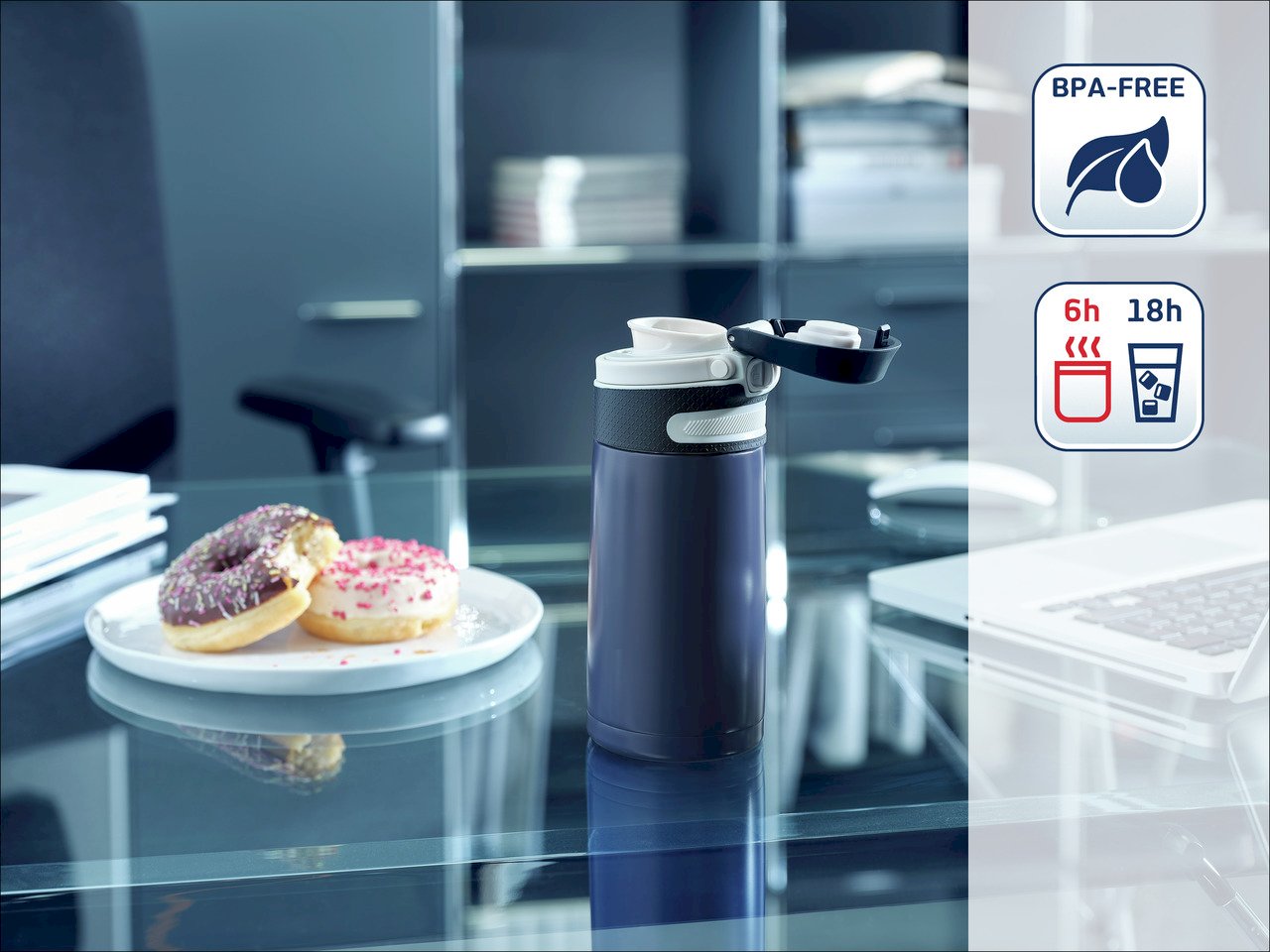 Leifheit Flip Термокружка, 350 мл, тёмно-синяя - практичная и полностью герметичная термокружка для горячих и холодных напитков, выполненная из прочной нержавеющей стали с двойными стенками, которые сохраняют тепло до 6 часов и холод до 18 часов. Кружка оснащена удобной крышкой с защитной фиксацией от случайного открытия и кнопкой для лёгкого использования одной рукой, что делает её идеальной для кофе, чая или других напитков в дороге. Компактный размер позволяет носить её в сумке или рюкзаке без риска протекания, а встроенная ручка облегчает переноску. Также предусмотрена возможность использования фильтра для фруктов или травяных настоев, что добавляет удобства в ежедневном использовании.