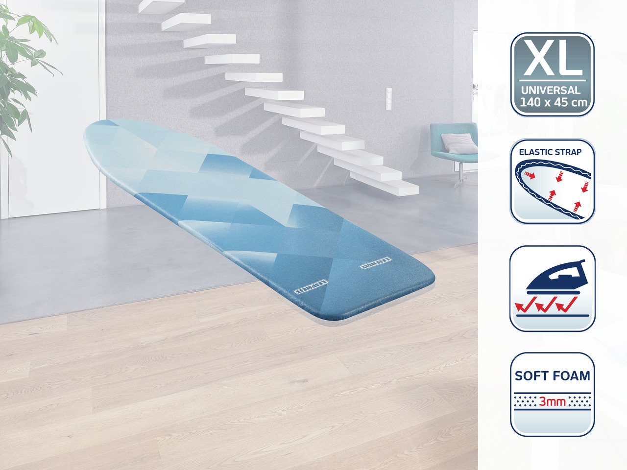 Leifheit Heat Reflect Universal 140 × 45 cm Чехол Для Гладильной Доски - высококачественный покрывной чехол для гладильной доски с отражающей тепло поверхностью и мягким 3 мм полиуретановым полимерным слоем, который ускоряет процесс глажения и улучшает скольжение утюга по ткани. Изготовлен из смеси хлопка, полиуретана и алюминия, материал эффективно отражает тепло и делает глажение легче, подходит для всех стандартных гладильных досок размером до 140 × 45 см. Чехол легко фиксируется с помощью эластичной шнуровки и клипсы, оптимизируя распределение тепла и повышая комфорт эксплуатации.