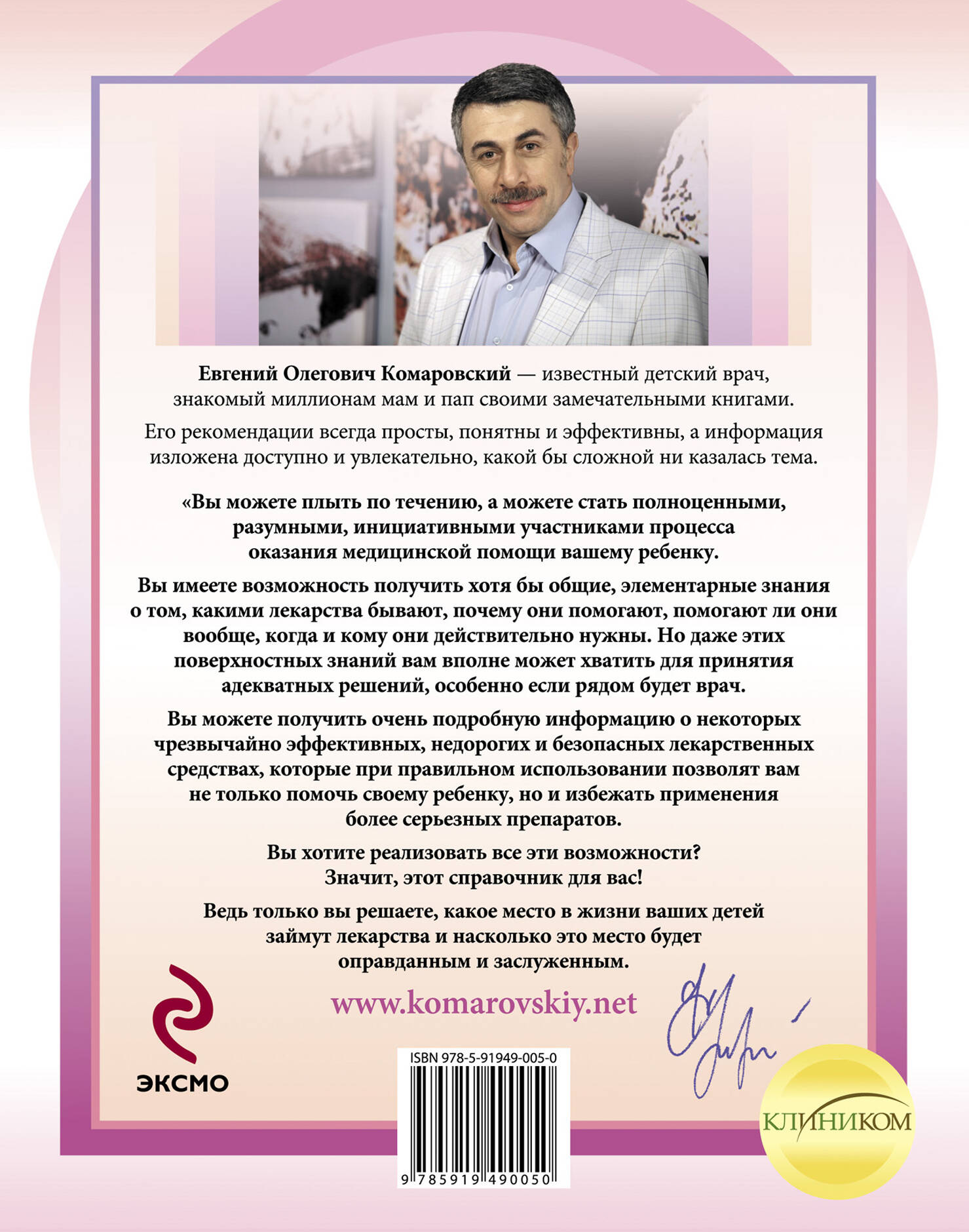 Что это за книга книга: Книга от известного педиатра, доктора Комаровского, включает в себя популярное изложение основ науки о лекарствах, а также обзор лекарственных средств, наиболее часто используемых в практической педиатрии. Особенности книги: Книга написана доступным языком, носит практический характер, содержит не только исчерпывающую информацию о тех, или иных лекарственных средствах, здесь вы также найдете множество ценных советов и рекомендаций от автора. Для кого эта книга: Это книга для мам, пап, бабушек и дедушек. Основная ее цель - создание условий для того, чтобы родительская лечебная самодеятельность была информированной, осознанной, минимально допустимой и максимально безопасной.| Издательство | Издательство "Клиником" ООО |