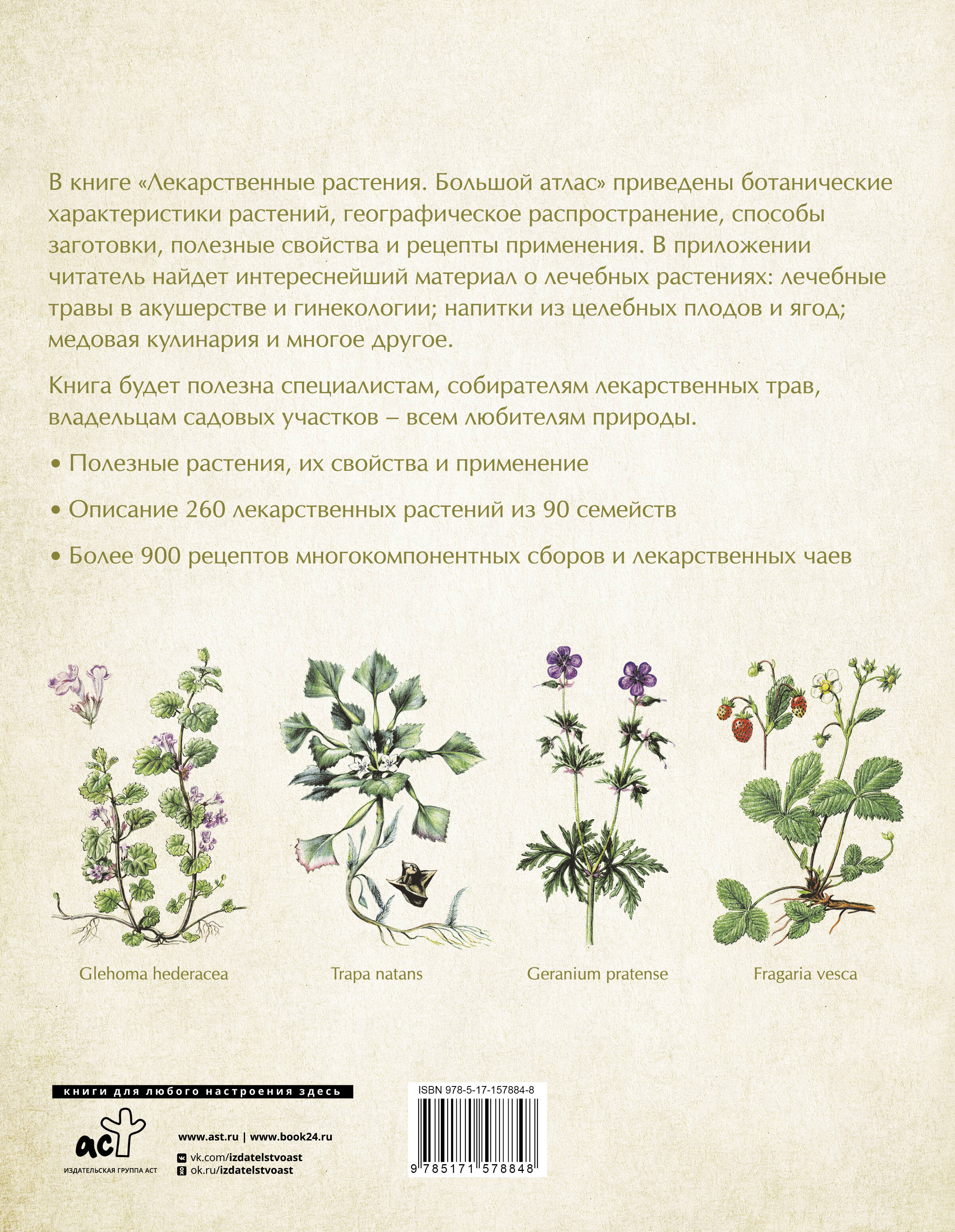 В Атласе приведены ботанические характеристики растений, географическое распространение, способы заготовки, полезные свойства и рецепты применения. В приложении читатель найдет интереснейший материал о лечебных растениях: лечебные травы в акушерстве и гинекологии; напитки из целебных плодов и ягод; медовая кулинария и многое другое. Книга будет полезна специалистам, собирателям лекарственных трав, владельцам садовых участков, всем любителям природы.| Издательство | ИЗДАТЕЛЬСТВО "АСТ" |
