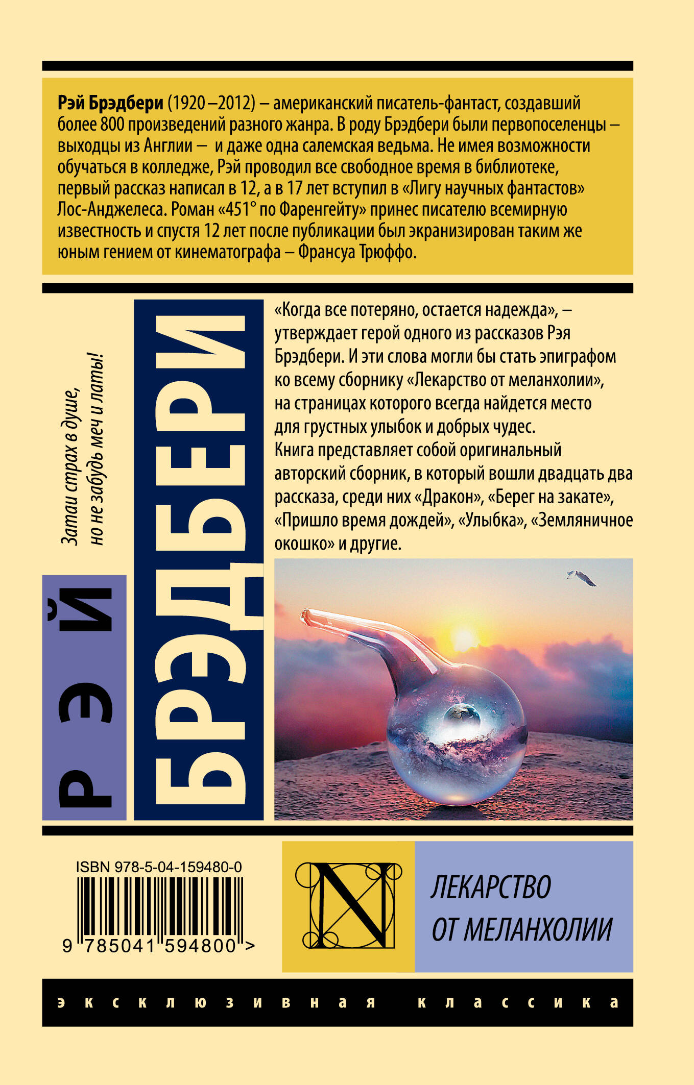 "Когда все потеряно, остается надежда", - утверждает герой одного из рассказов Рэя Брэдбери. И эти слова могли бы стать эпиграфом ко всему сборнику "Лекарство от меланхолии", на страницах которого всегда найдется место для грустных улыбок и добрых чудес. Книга представляет собой оригинальный авторский сборник, в который вошли двадцать два рассказа, среди них "Дракон", "Берег на закате", "Пришло время дождей", "Улыбка", "Земляничное окошко" и другие.| Издательство | Эксмо |