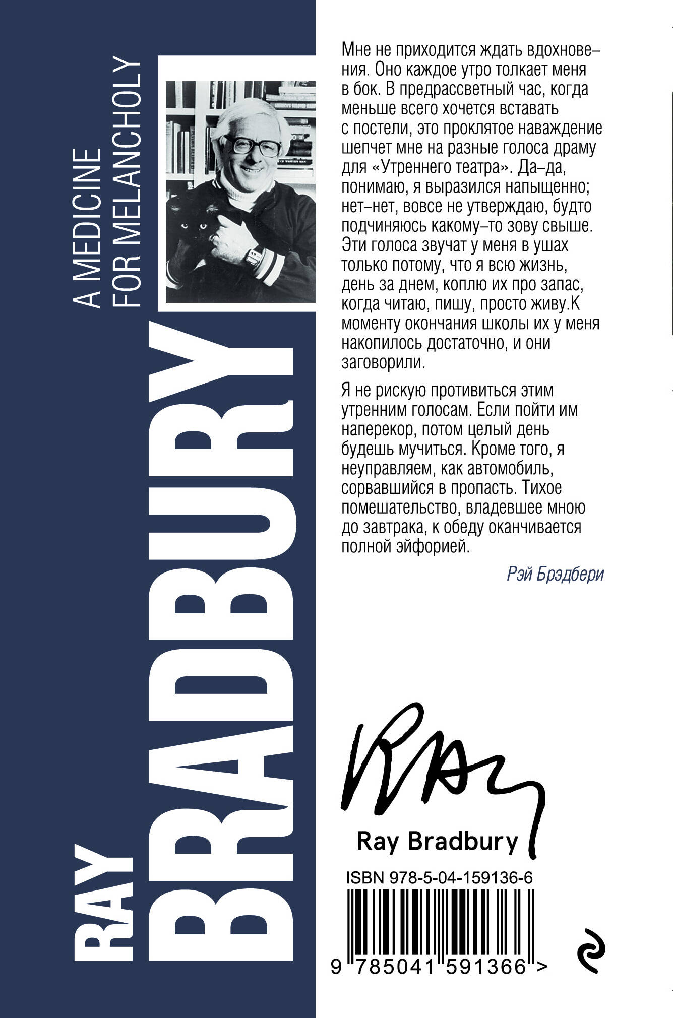 За свою творческую карьеру известный американский писатель Рэй Брэдбери создал несколько сотен рассказов, и сборник «Лекарство от меланхолии» - один из самых любимых читателями. В нем собрано девятнадцать рассказов автора, среди них «Все лето в один день», «Дракон», «Берег на закате» и другие. В каком бы уголке галактики ни происходило действие - в прошлом ли, в будущем, в настоящем - у Брэдбери всегда получается ухватить самую суть, самую яркую искру человеческого чувства, и передать ее читателю. Этот сборник станет огоньком надежды в непогожее время и сможет вдохновить каждого, наполнив ярчайшими самоцветами разных эмоций.| Издательство | ООО "Издательство "Эксмо" |