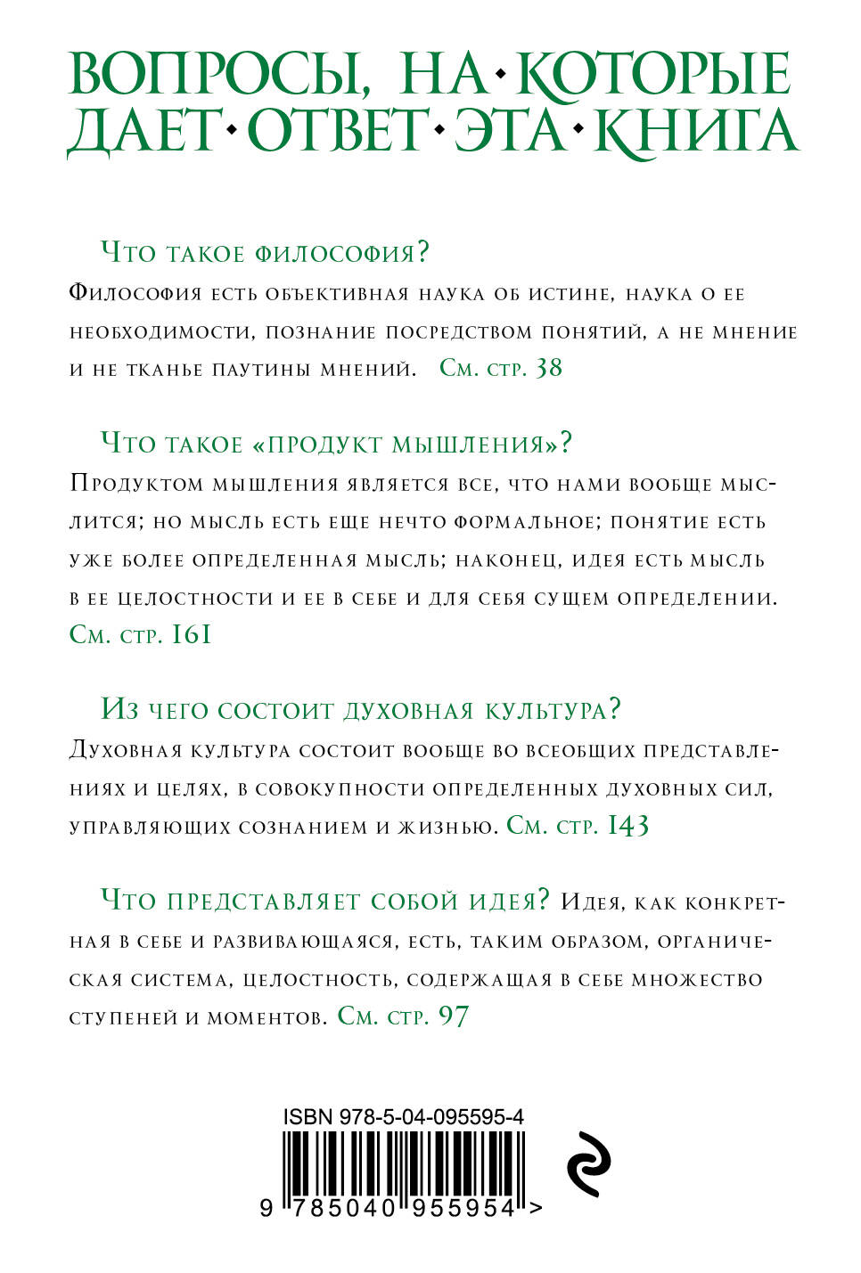 О книге: Георг Гегель (1770-1831) стал символом эпохи классического немецкого идеализма. Мыслители рассуждали тогда о возможностях человеческого разума, об «уровнях» отражения реальности в восприятии человека, о соотношении духовного и материального начал. Все это базировалось на идеях века Просвещения с его преклонением перед наукой и революционными идеями о правах человека. Гегель же уничтожает грань между субъектом и объектом, провозглашая: мышление и бытие суть одно и то же. Гегелевский идеализм породил как восторженных поклонников теорий великого мыслителя, так и яростных противников оных. Но ведь цель философии - именно в том, чтобы помочь человеку научиться мыслить и рассуждать. Умение, необходимое везде и всегда. О серии: Серия «Великие идеи» представляет собой библиотеку выдающихся образцов человеческой мысли. Это подборка знаменитых произведений мыслителей всех времен и народов. Это главные произведения философов с древнейших времен: от Конфуция и Платона до Фрейда и Ницше. Мы особенно тщательно подбираем произведения, которые просто необходимо иметь в своей библиотеке как студентам, так и всем образованным и эрудированным людям. Удобный карманный формат, мягкая обложка позволят знакомиться с литературными трудами по пути в институт или на работу. Наши редакторы для удобства использования выделили в каждой книге раздел «Избранные цитаты», которые позволят при необходимости быстро вспомнить ключевые мысли авторов. Для кого: - для тех, кто интересуется философией, - для тех, кто ценит удобные форматы.| Издательство | ООО "Издательство "Эксмо" |