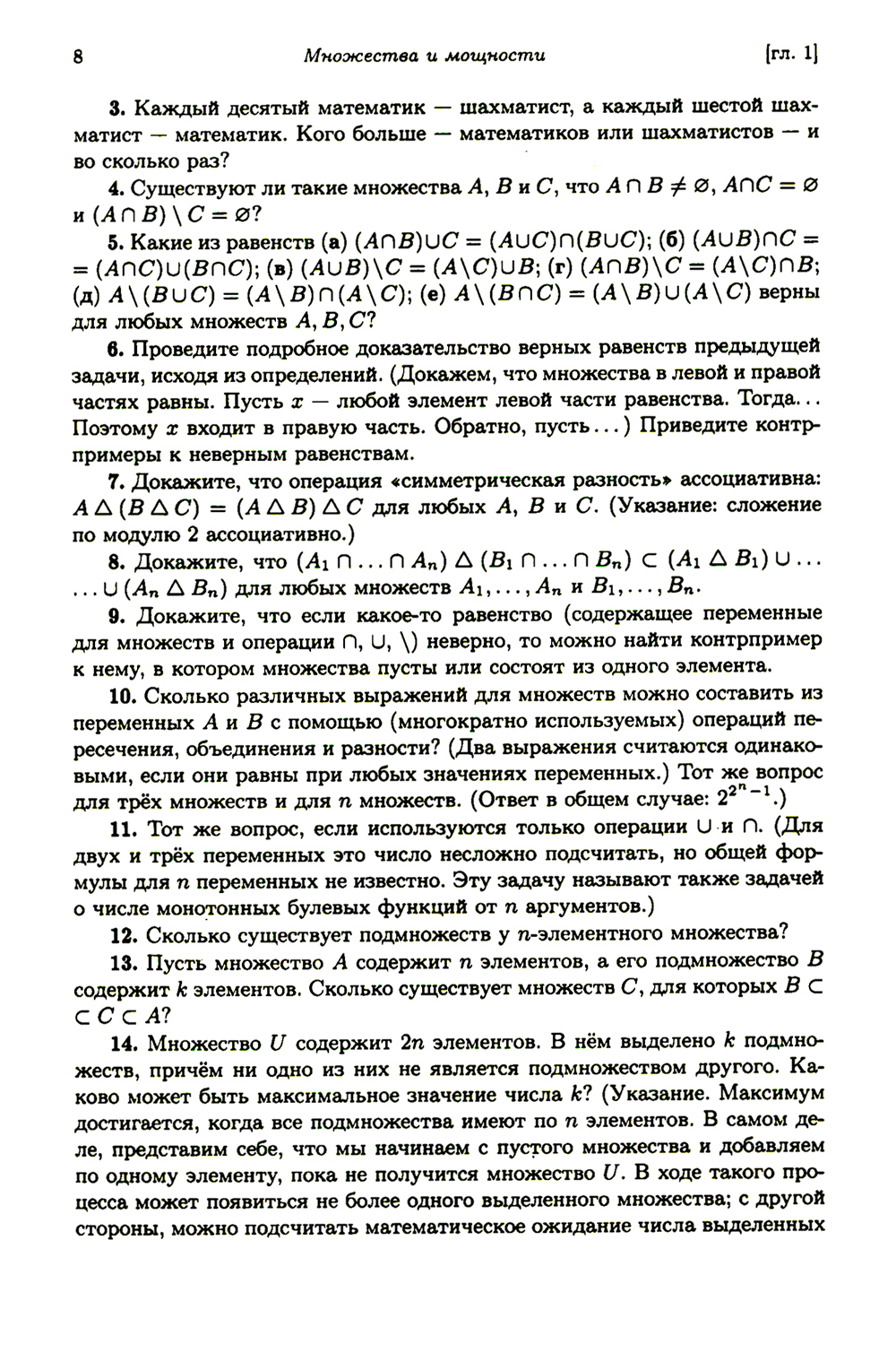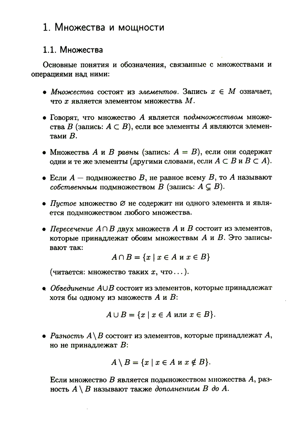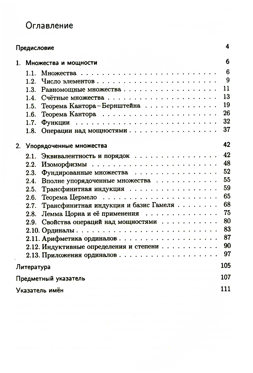 Книга написана по материалам лекций и семинаров, проводившихся авторами для студентов младших курсов мехмата МГУ. В ней рассказывается об основных понятиях «наивной теории множеств» (мощности, упорядоченные множества, трансфинитная индукция, ординалы). Изложение рассчитано на учеников математических школ, студентов-математиков и всех интересующихся основами теории множеств. Книга включает около 150 задач различной трудности.