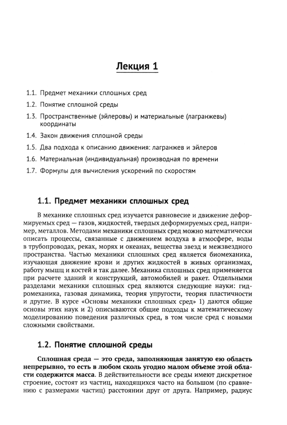 Настоящая книга содержит лекции по курсу «Основы механики сплошных сред», которые были прочитаны автором для студентов второго курса отделения механики механико-математического факультета Московского государственного университета имени М.В.Ломоносова. Лекции охватывают следующие разделы механики сплошных сред: элементы тензорного исчисления; основные понятия, используемые для описания движения и деформирования сплошных сред; универсальные физические законы сохранения и следующие из них дифференциальные уравнения и условия на поверхностях сильного разрыва; простейшие модели жидкостей, газов и упругих сред. Книга предназначена для исследователей в области механики, а также преподавателей и студентов соответствующих специальностей.