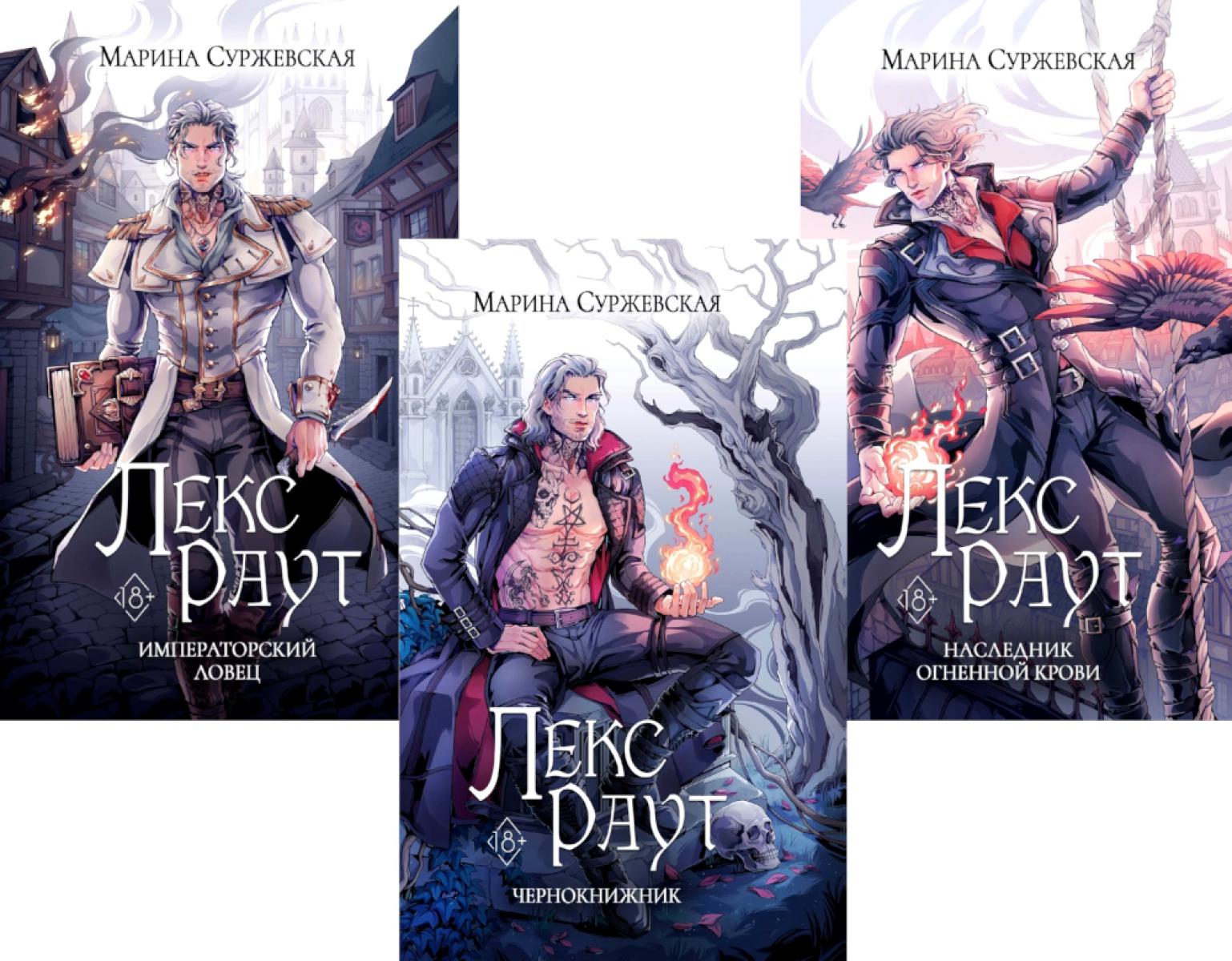 Комплект из трех книг Марины Суржевской содержит следующие произведения: «Лекс Раут. Чернокнижник» Я не афиширую род своей деятельности, не даю объявлений на столбах и не оплачиваю услуги крикливых зазывал. Я чаще отказываюсь от заказов, чем соглашаюсь на них. Мои ритуалы требуют крови, и чаще всего это кровь заказчика. Мне плевать, если вы умрете в процессе, я всегда беру оплату вперед. Так что хорошо подумайте, прежде чем постучать в мою дверь. Меня зовут Лекс Раут, я - чернокнижник. «Лекс Раут. Императорский ловец» Из чернокнижника - в императорские ловцы? Ужасно, но лучше, чем петля на шее! Но вот чует моя черная душонка в этом предложении какой-то подвох... Да и быть темным магом в Бастионе ловцов - худшее, что можно придумать. Правда, выбора у меня нет, так что... Меня зовут Лекс Раут. Я - императорский ловец. «Лекс Раут. Наследник огненной крови» Спас мир - стал героем? Да как бы не так! Мир я, конечно, спас, да вот только в герои меня никто не записывает. Кайер встретил неласково, ловцы грозят лишением силы наследники трона куда-то пропали, и проклятая Одри не желает меня вспоминать. А разгребать все это снова придется мне. Меня зовут Лекс Раут. И только Изнанка знает, кто я.| Издательство | Т8 RUGRAM |
