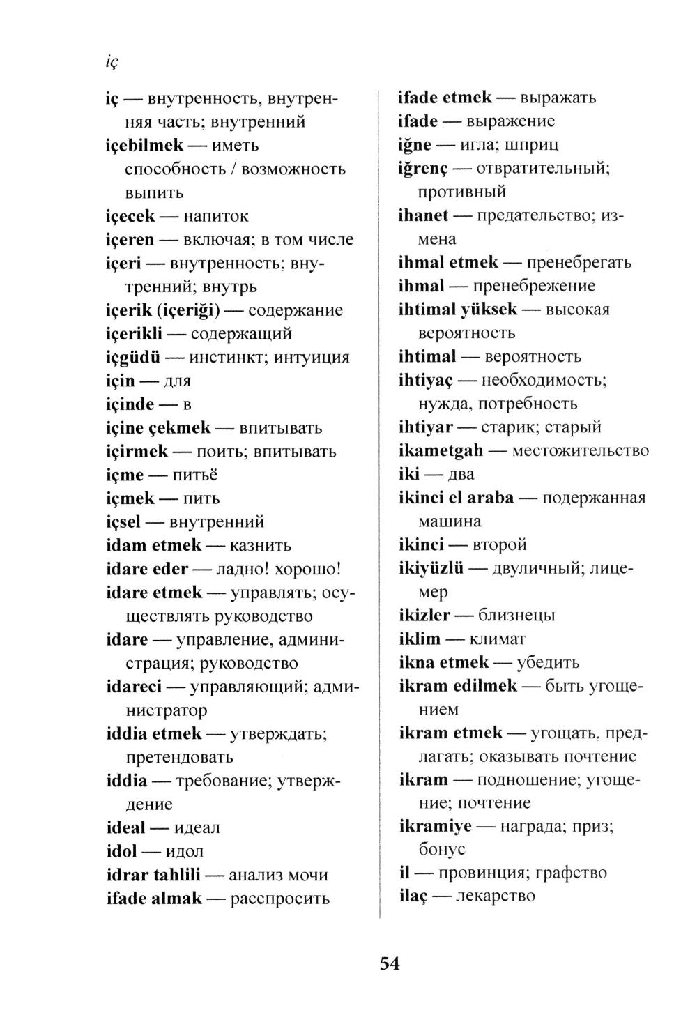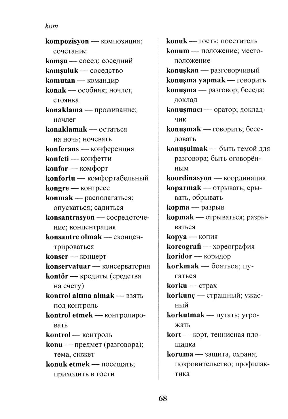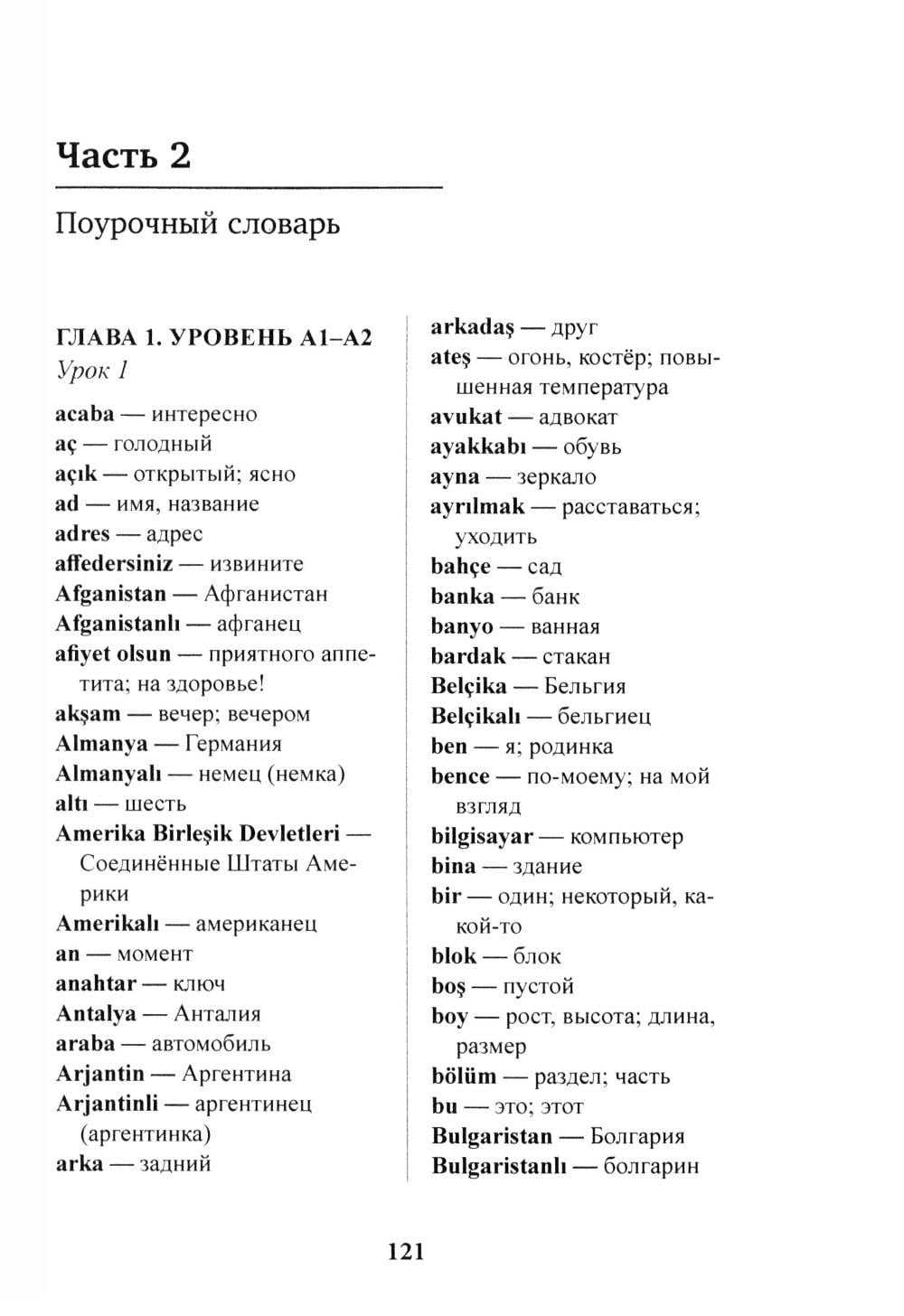 Данное пособие содержит около 5500 турецких лёексем и предназначено для студентов институтов и факультетов иностранных языков, а также для всех изучающих турецкий язык в качестве учебного справочного пособия по лексике, подлежащей активному усвоению на I-V курсах. Пособие состоит из двух частей: в первой части в алфавитном порядке даются слова и устойчивые выражения, во второй части приводятся списки слов по курсам и урокам (А1-С2). Краткий грамматический справочник, содержащий информацию по образованию и значению основных именныхи глагольных словоизменительных аффиксов, позволит понять базовые принципы словоизменения в турецком языке.| Издательство | Восточная книга |