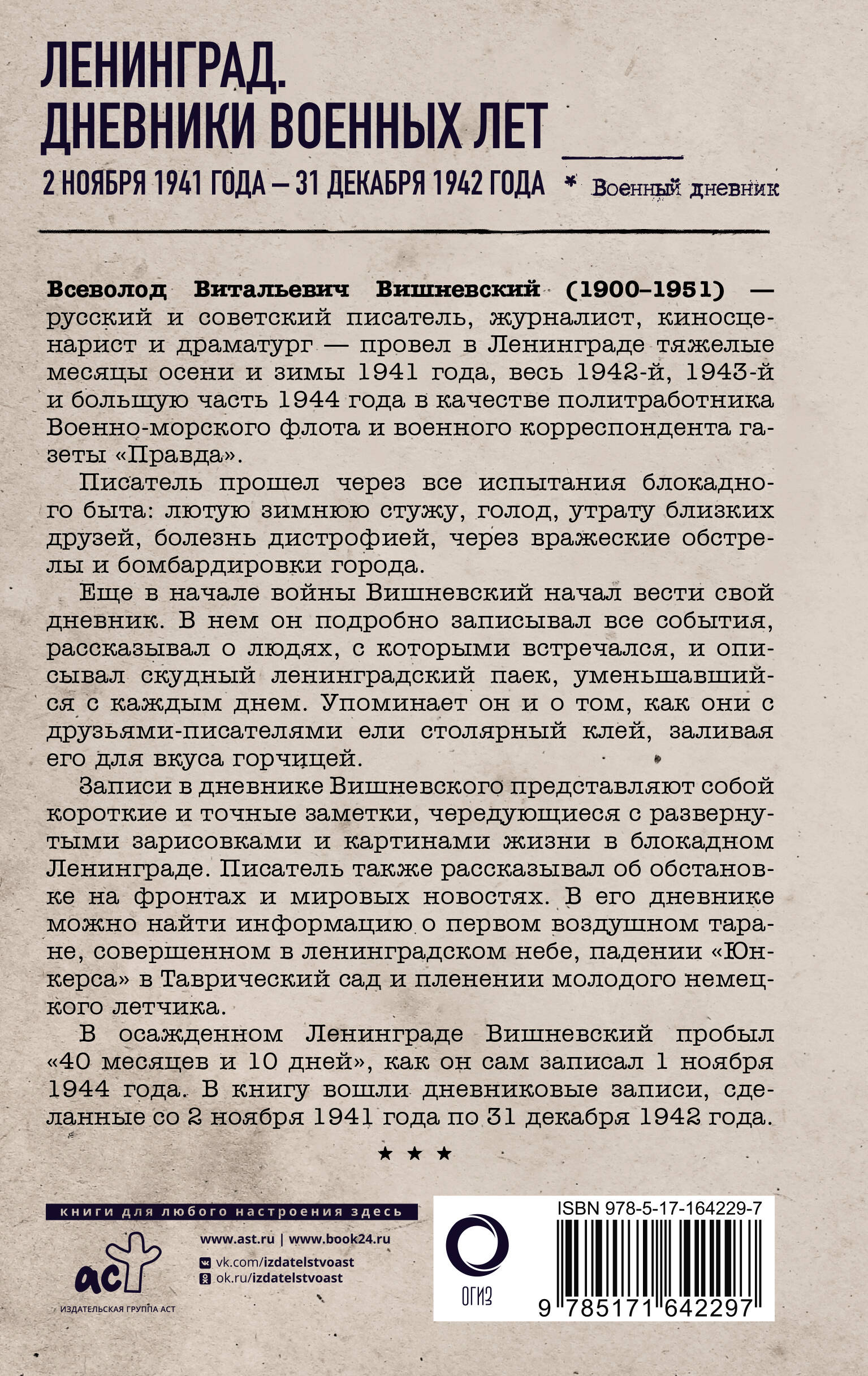 Всеволод Витальевич Вишневский (1900-1951) -- русский и советский писатель, журналист, киносценарист и драматург -- провел в Ленинграде тяжелые месяцы осени и зимы 1941 года, весь 1942-й, 1943-й и большую часть 1944 года в качестве политработника Военно-морского флота и военного корреспондента газеты "Правда". Писатель прошел через все испытания блокадного быта: лютую зимнюю стужу, голод, утрату близких друзей, болезнь дистрофией, через вражеские обстрелы и бомбардировки города. Еще в начале войны Вишневский начал вести свой дневник. В нем он подробно записывал все события, рассказывал о людях, с которыми встречался, и описывал скудный ленинградский паек, уменьшавшийся с каждым днем. Главная цель дневников Вишневского -- сохранить для истории наблюдения и взгляды современников, рассказать о своих ошибках и победах, чтобы будущие поколения могли извлечь уроки. Его дневники являются уникальным художественным явлением и памятником Великой Отечественной войны. В осажденном Ленинграде Вишневский пробыл "40 месяцев и 10 дней", как он сам записал 1 ноября 1944 года. В книгу вошли дневниковые записи, сделанные со 2 ноября 1941 года по 31 декабря 1942 года.| Издательство | Издательство "АСТ" |