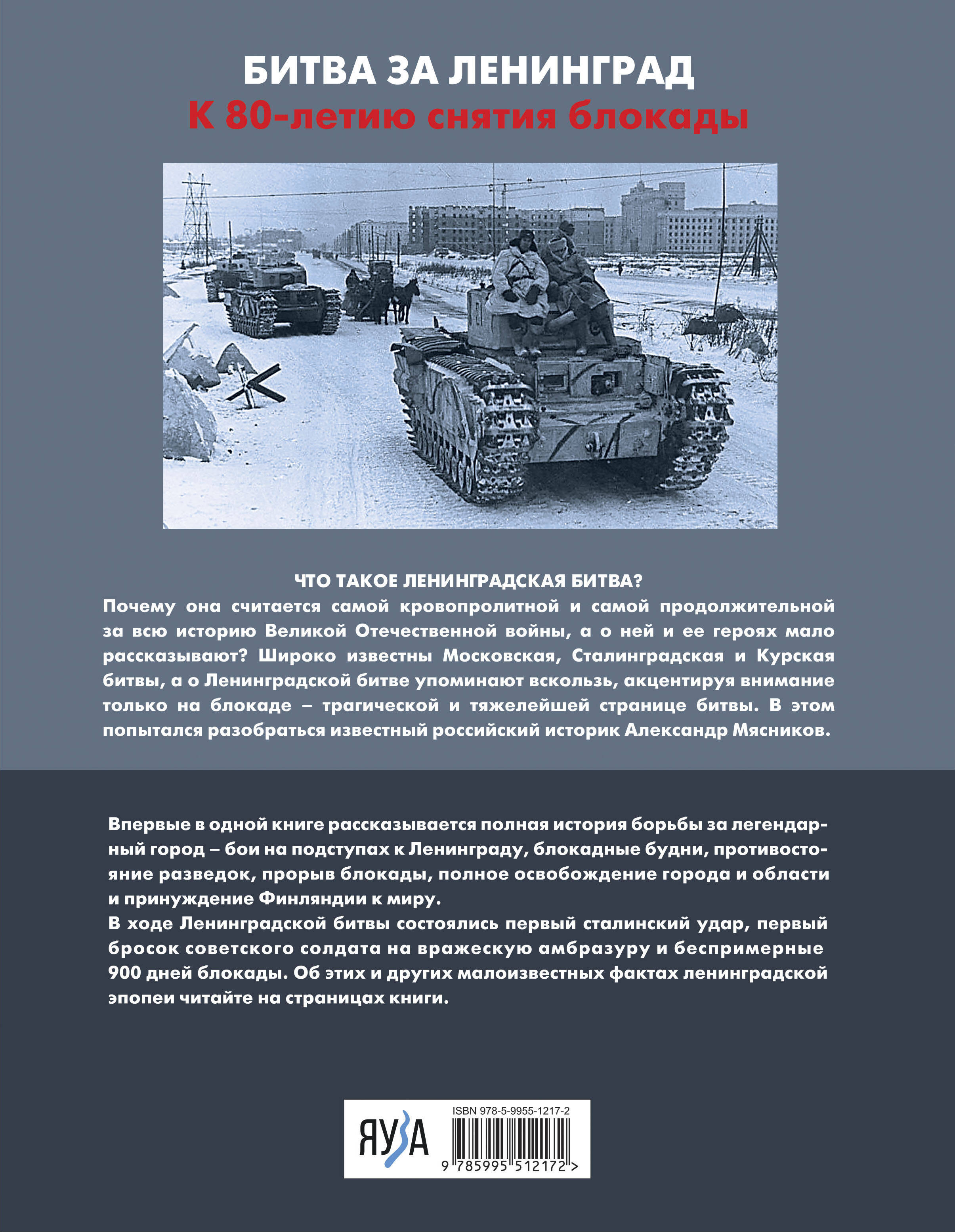 Что такое Ленинградская битва? Почему она считается самой кровопролитной и самой продолжительной за всю историю Великой Отечественной войны, а о ней и ее героях мало рассказывают? Широко известны Московская, Сталинградская и Курская битвы, а о Ленинградской битве упоминают вскользь, акцентируя внимание только на Блокаде - трагической и тяжелейшей странице битвы. В этом попытался разобраться известный российский историк Александр Мясников. Впервые в одной книги рассказывается полная история борьбы за легендарный город - бои на подступах к Ленинграду, блокадные будни, противостояние разведок, прорыв Блокады, полное освобождение города и области и принуждение Финляндии к миру. В ходе Ленинградской битвы состоялись первый Сталинский удар, и первый бросок советского солдата на вражескую амбразуру, и беспримерные 900 дней Блокады. Об этих и других малоизвестных фактах Ленинградской эпопеи читайте на страницах книги. Текст дополнен важными цитатами из документов и фотографиями, многие из которых публикуются впервые.| Издательство | ООО "Издательство "Эксмо" |