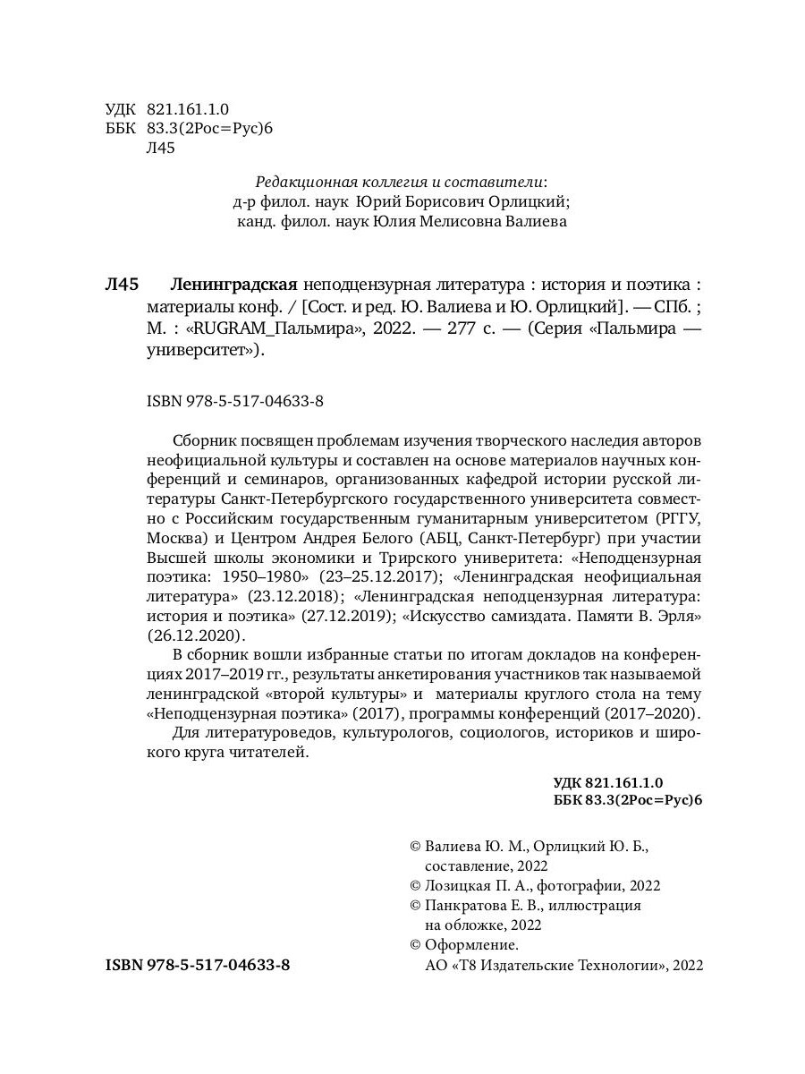 Сборник посвящен проблемам изучения творческого наследия авторов неофициальной культуры и составлен на основе материалов научных конференций и семинаров, организованных кафедрой истории русской литературы Санкт-Петербургского государственного университета совместно с Российским государственным гуманитарным университетом (РГГУ, Москва) и Центром Андрея Белого (АБЦ, Санкт-Петербург) при участии Высшей школы экономики и Трирского универитета: «Неподцензурная по этика: 1950-1980» (23-25.12.2017); «Ленинградская неофициальная литература» (23.12.2018); «Ленинградская неподцензурная литература: история и поэтика» (27.12.2019); «Искусство самиздата. Памяти В. Эрля» (26.12.2020). В сборник вошли избранные статьи по итогам докладов на конференциях 2017-2019 гг., результаты анкетирования участников так называемой ленинградской «второй культуры» и материалы круглого стола на тему «Неподцензурная поэтика» (2017), программы конференций (2017-2020). Для литературоведов, культурологов, социологов, историков и широкого круга читателей.| Издательство | Т8 RUGRAM |