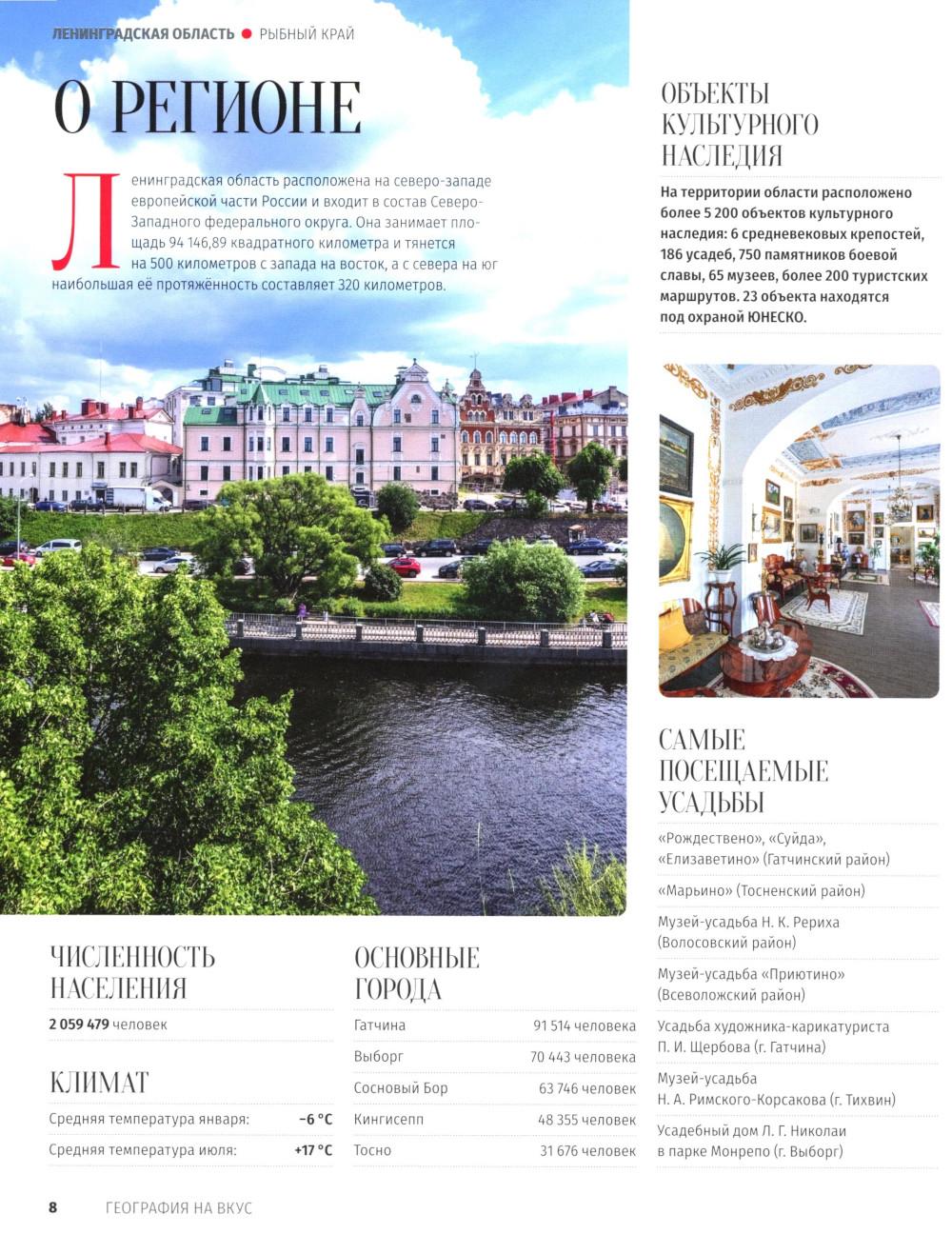 Во втором авторском туристическо-гастрономическом гиде по Ленинградской области из серии путеводителей «География на вкус» собрано более 60 заведений и множество рецептов фирменных блюд от лучших поваров этого региона России. Наряду с ресторанами высокой кухни, гастробистро и кафе представлены фермы, объекты агротуризма и крафтовые производства локальных продуктов. Кроме того, авторы отметили лучшие десерты Ленинградской области и места, где подают вкусные завтраки. Знакомство с каждым регионом Ленинградской области начинается с заметок журналиста, доктора исторических наук Александра Сидорова, в которых он рассказывает об истории места и даёт описание достопримечательностей, которые обязательно нужно посетить. Также вы найдёте в этом гиде рекомендации по лучшим отелям региона и автомобильные маршруты по достопримечательностям региона. И всё это иллюстрировано работами официального фотографа проекта Якова Титова и работами фотографа Инги Павловой.| Издательство | Вероникас Гурме Гид |