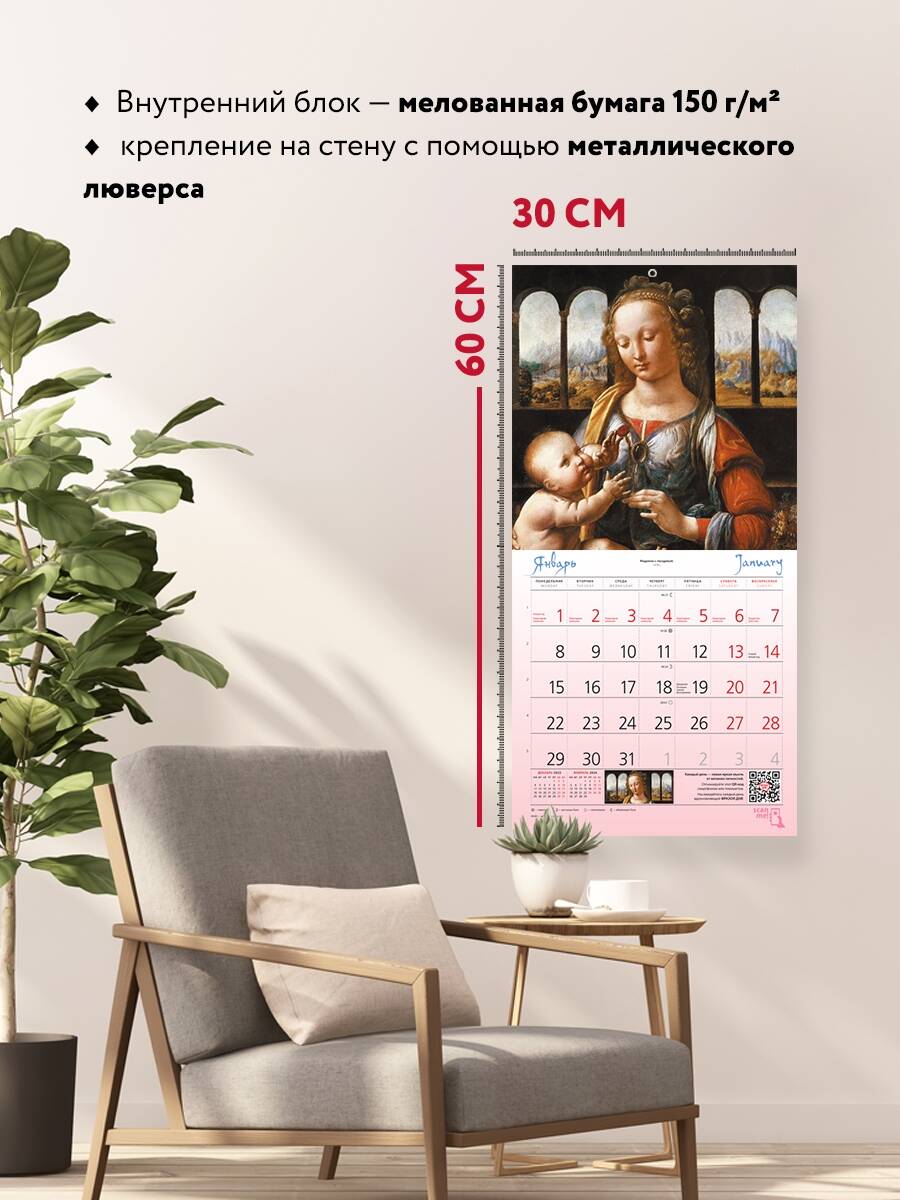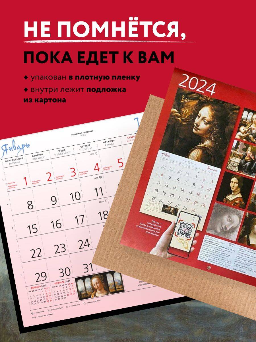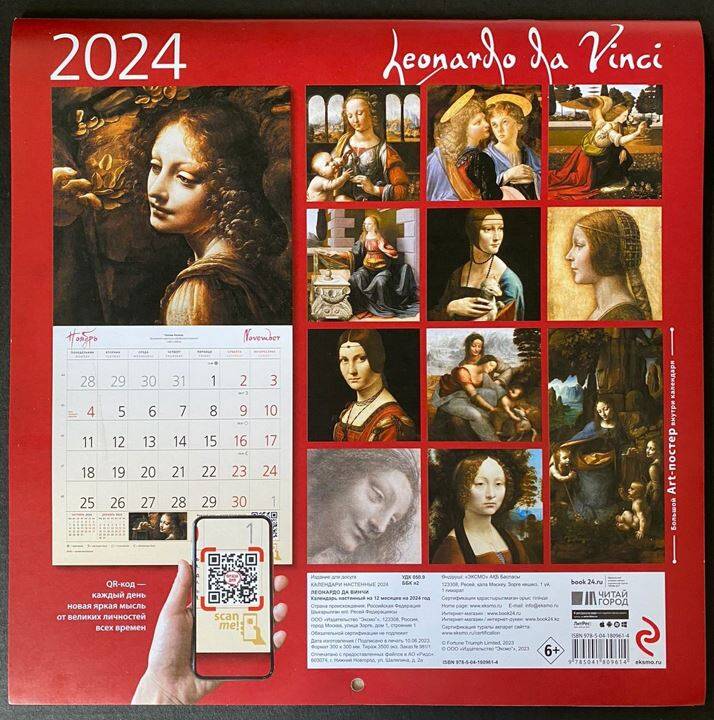 О серии: Наши настенные календари отличаются высоким качеством исполнения! Тщательно подобранные иллюстрации, напечатанные на глянцевой бумаге высочайшего качества, станут настоящим украшением дома, а в календарной сетке найдется место для ваших планов: большие клетки позволят делать записи и организовать свой год! В календаре также отмечены все государственные праздники. В серии настенных календарей издательства «ЭКСМО» каждый найдет тему по вкусу: великие художники, великолепные подборки с самыми знаменитыми произведениями искусства, легендарные кинематографические саги и игры, главные книжные авторы и бестселлеры, фотографии и иллюстрации любимых животных и многое-многое другое! О календаре: Практичный и эстетичный, этот календарь каждый месяц будет радовать вас. Прекрасные картины органично дополнят любой интерьер и помогут планировать время. В этом календаре представлены шедевры кисти Леонардо да Винчи. Для кого: Высокое качество полиграфического исполнения прекрасно дополняет репродукции шедевров живописи, что непременно будет по достоинству оценено людьми с хорошим вкусом. Технические параметры: Тип календаря - настенный перекидной Год - 2024 Календарная сетка - с разбивкой по месяцам Вид скрепления - скрепка Ширина - 30 см Высота - 30 см Внутренний блок - мелованная бумага 150 г/м2 Подложка - плотный гофрокартон для поддержания формы Индивидуальная упаковка в плотный целлофановый пакет| Издательство | ООО "Издательство "Эксмо" |