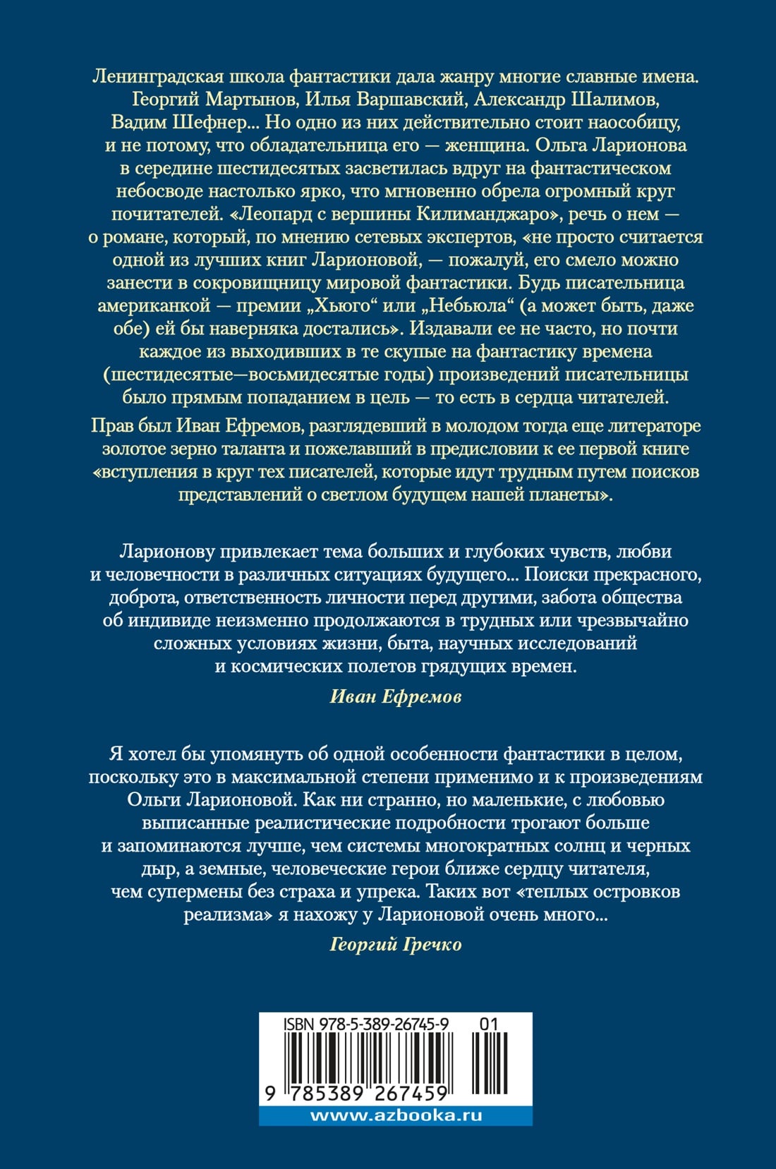 Ленинградская школа фантастики дала жанру многие славные имена. Георгий Мартынов, Илья Варшавский, Александр Шалимов, Вадим Шефнер… Но одно из них действительно стоит наособицу, и не потому, что обладательница его - женщина. Ольга Ларионова в середине шестидесятых засветилась вдруг на фантастическом небосводе настолько ярко, что мгновенно обрела огромный круг почитателей. «Леопард с вершины Килиманджаро», речь о нем - о романе, который, по мнению сетевых экспертов, «не просто считается одной из лучших книг Ларионовой, - пожалуй, его смело можно занести в сокровищницу мировой фантастики. Будь писательница американкой - премии "Хьюго" или "Небьюла" (а может быть, даже обе) ей бы наверняка достались». Издавали ее не часто, но почти каждое из выходивших в те скупые на фантастику времена (шестидесятые-восьмидесятые годы) произведений писательницы было прямым попаданием в цель - то есть в сердца читателей. И «Вахта "Арамиса"», внешне вроде бы боевик - космические контрабандисты и все такое, - но сколько было в повести новизны, свежести, ярких образов и непростых, яростных ситуаций. И цикл «Сонат», навеянных удивительной живописью Чюрлёниса. И «Чакра Кентавра», поначалу задуманная как шутка и вылившаяся в полноценную «космооперу», - своего рода наш достойный ответ «звездному королю» Гамильтону. Прав был Иван Ефремов, разглядевший в молодом тогда еще литераторе золотое зерно таланта и пожелавший в предисловии к ее первой книге «вступления в круг тех писателей, которые идут трудным путем поисков представлений о светлом будущем нашей планеты».| Издательство | Азбука |