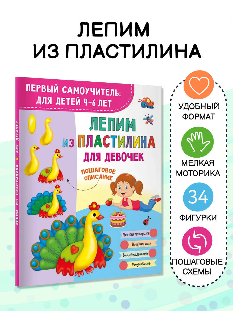 Самоучитель «Лепим из пластилина для девочек» - это коллекция мастер-классов с простыми детальными инструкциями и наглядными картинками. Крупные и красочные пошаговые иллюстрации понятны даже маленькому ребёнку, который ещё не умеет читать. Великолепные поделки собираются из самых простых базовых фигур: шариков, колбасок, полосок, валиков. Малышка научится лепить цветы и ягоды, конфеты и печенье, принцесс и фей, различных животных и многое другое. Материал книги расположен от простого к сложному. В книге 64 страницы формата А4, качественная печать, белая плотная бумага. Лепка - лучший способ развить мелкую моторику, пространственное мышление и воображение. Отличный подарок девочке на любой праздник. Прекрасная идея, как провести время всей семьёй весело и с пользой - удовольствие гарантировано и детям, и взрослым!| Издательство | Издательство "АСТ" |