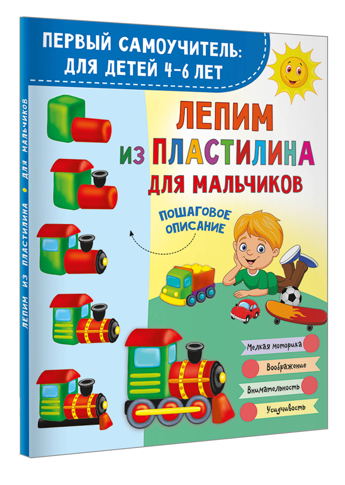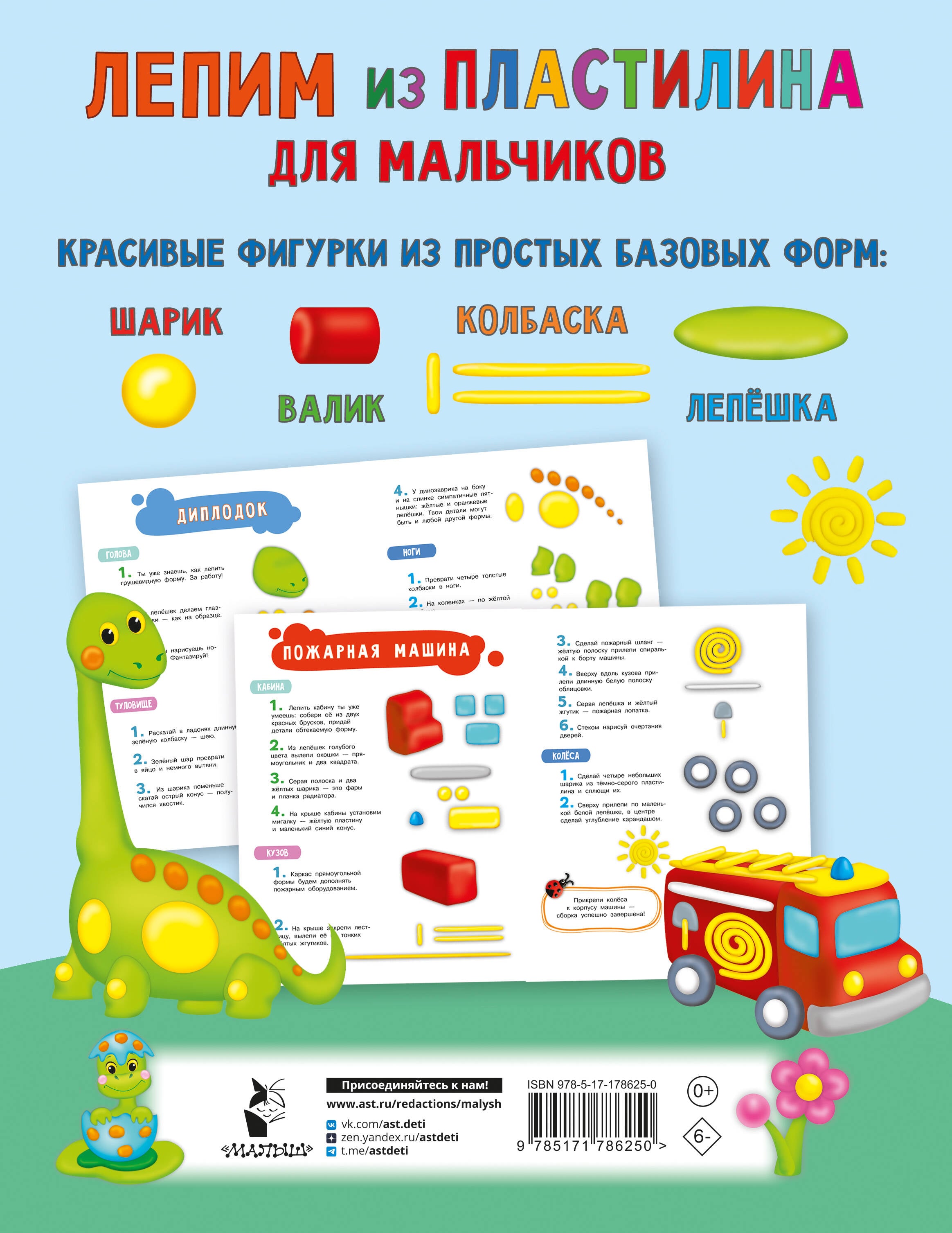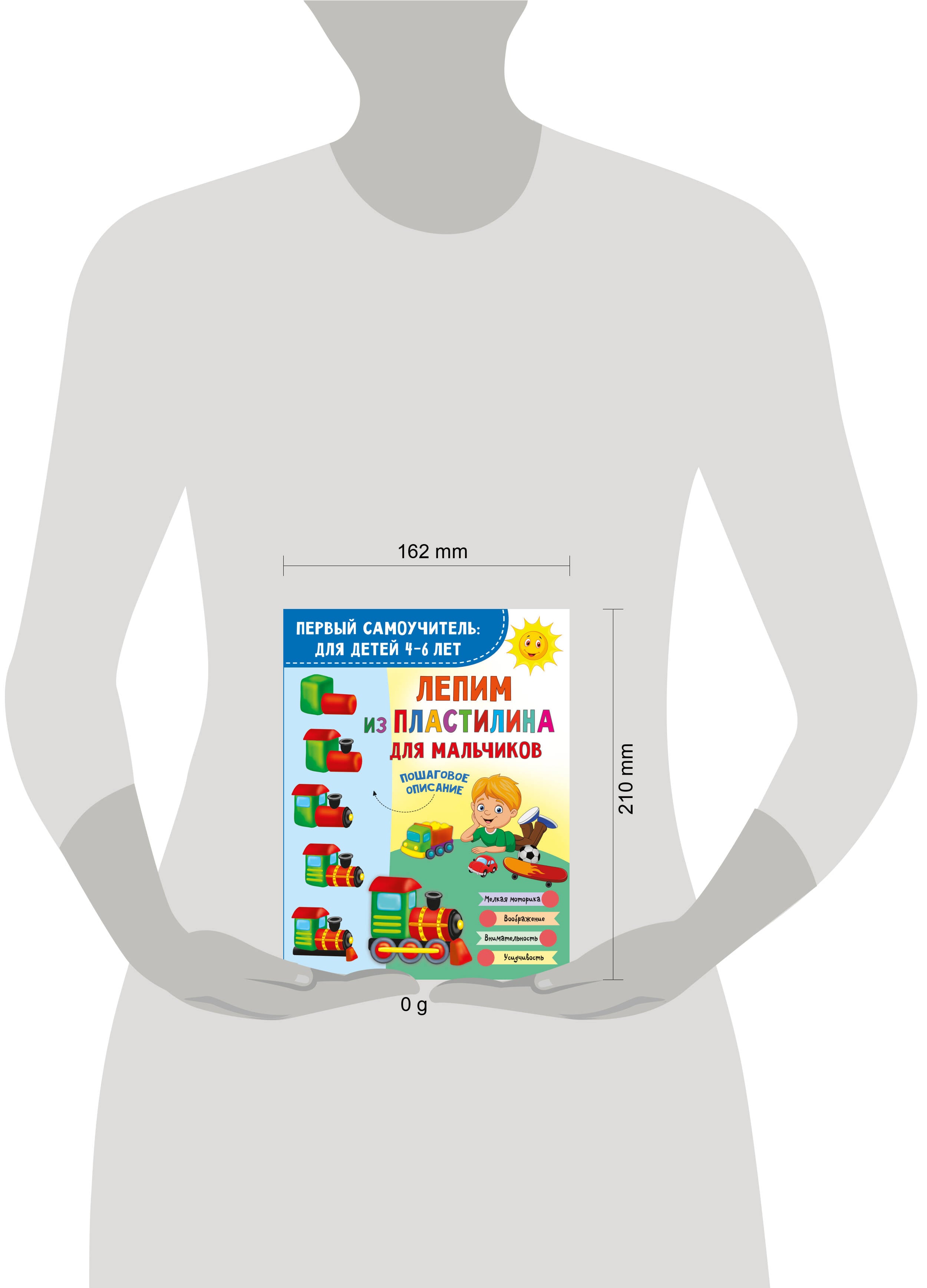 "Лепим из пластилина для мальчиков" - самоучитель, который поможет малышу своими руками сделать фигурки из пластилина. Детальные уроки, пошаговые схемы и крупные красочные образцы - ребёнок сможет справиться даже без помощи взрослых! Классная подборка поделок, которые будут интересны мальчикам: динозаврики, машинки, забавные персонажи и зверята. Занимаясь лепкой по нашей книге, ребёнок потренирует пальчики и подготовит руку к письму, разовьёт воображение и творческое мышление, внимательность и усидчивость. Для дошкольного возраста.| Издательство | Издательство "АСТ" |