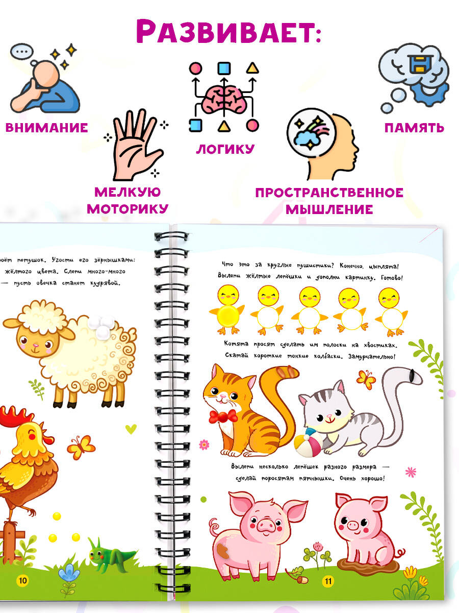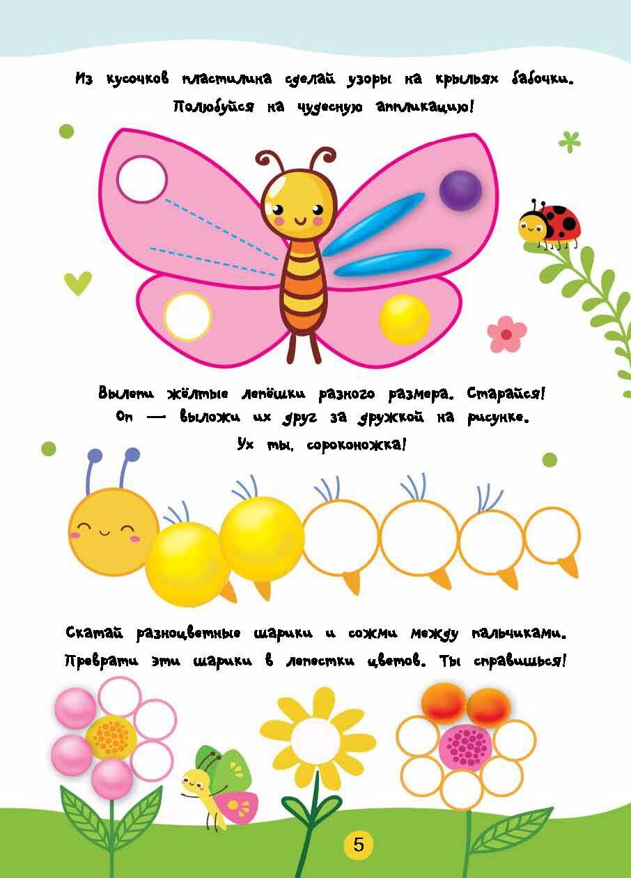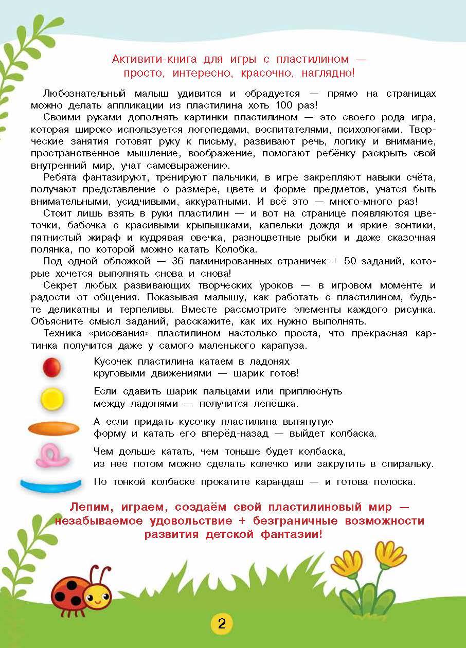 Активити-книга для игры с пластилином - это одновременно и развлекательная, и обучающая, и познавательная книжка, и рабочая тетрадь. Лепи + стирай + учись + новое узнавай: • Тренируем пальчики, развиваем сенсорику, мелкую моторику, пространственное мышление. • Формируем представление о предметах, их цвете, форме и размере. • Развиваем речь и зрительное восприятие: с выражением читаем ребёнку игровые задания, рассматриваем и обсуждаем крупные яркие иллюстрации. • Развиваем художественный вкус, внимание, воображение. • Знакомим с окружающим миром, формируем познавательный интерес. • Стимулируем логическое и образное мышление. • Тренируем зрительную память, концентрацию внимания. • Воспитываем интерес к чтению, развивающим занятиям. • Улучшаем эмоциональное состояние малыша.