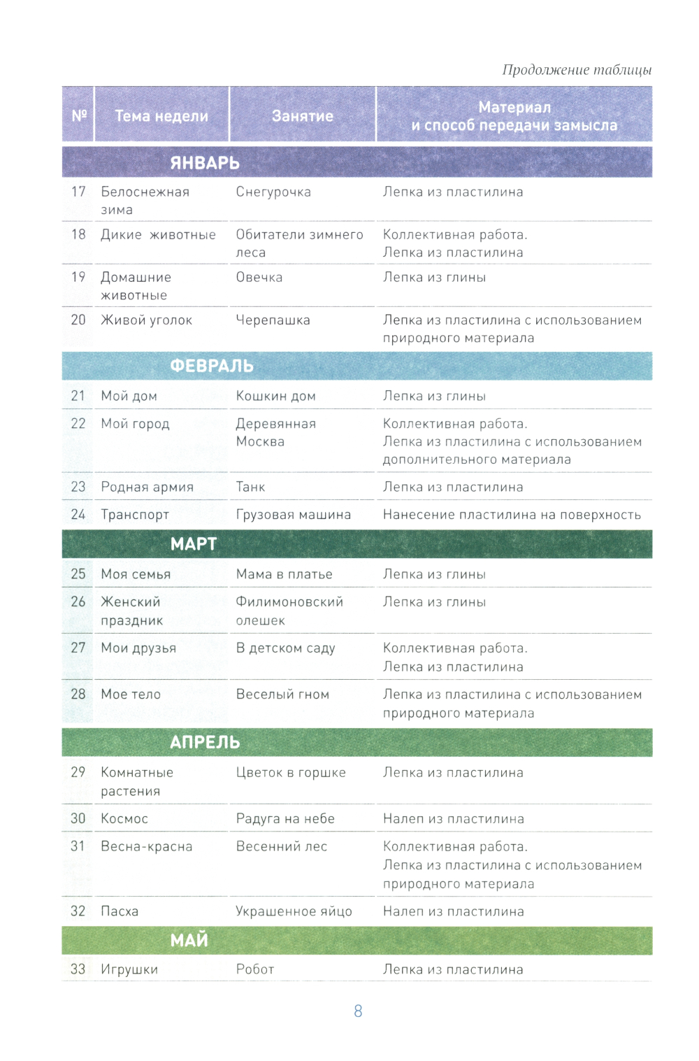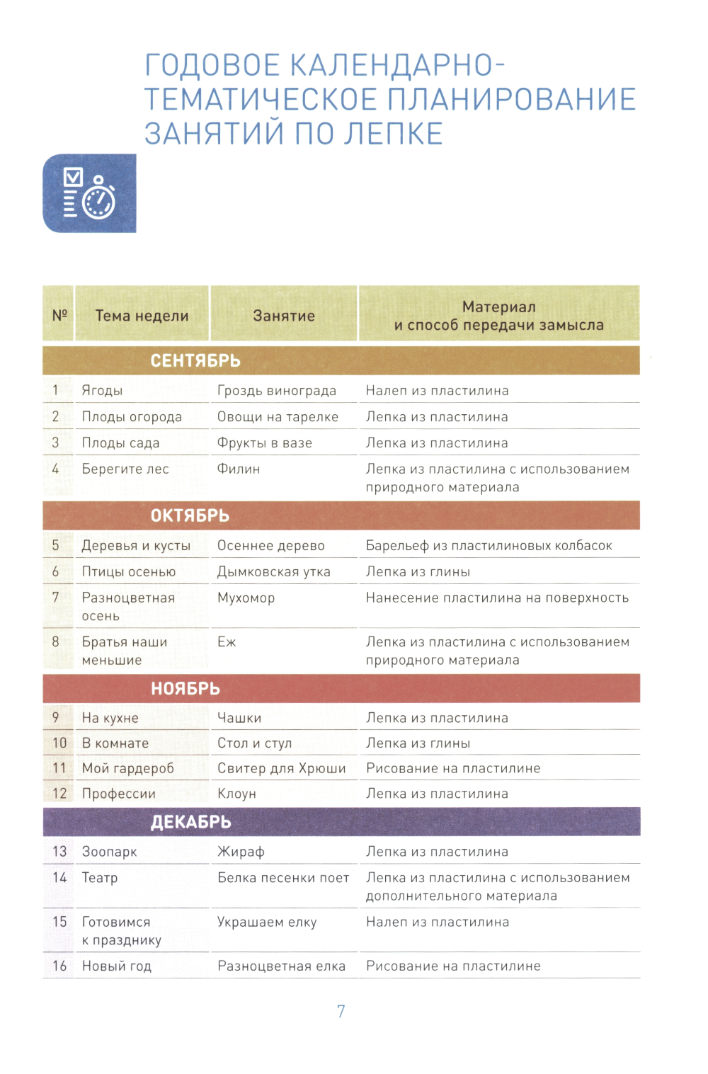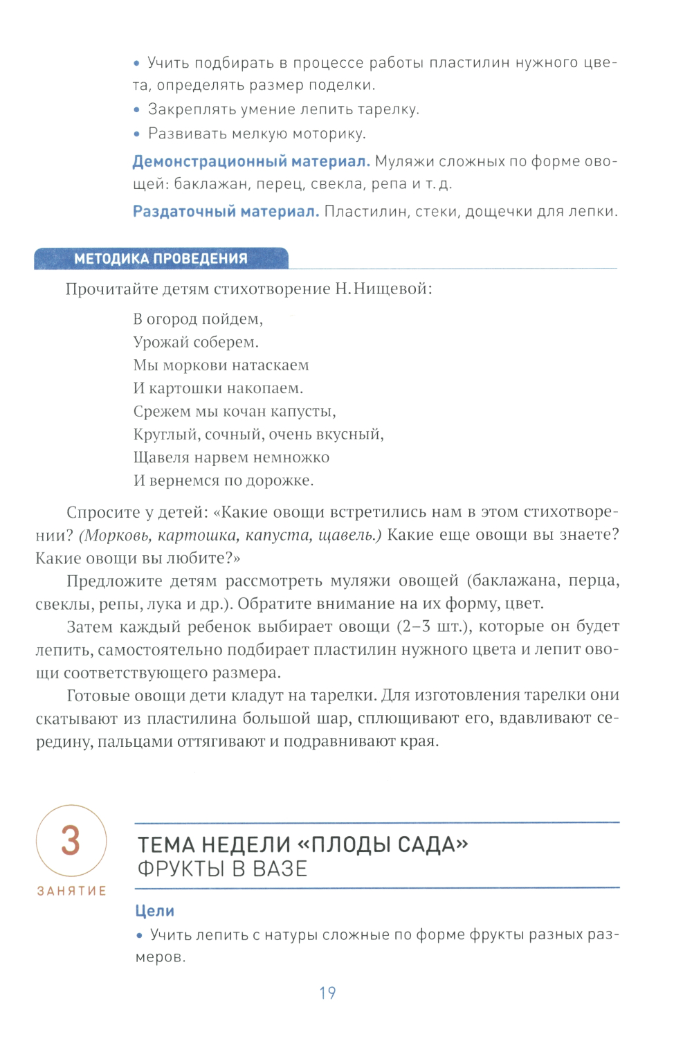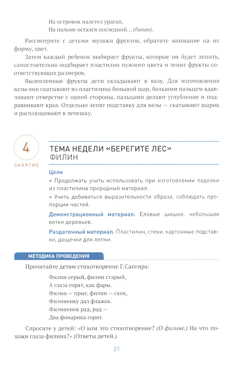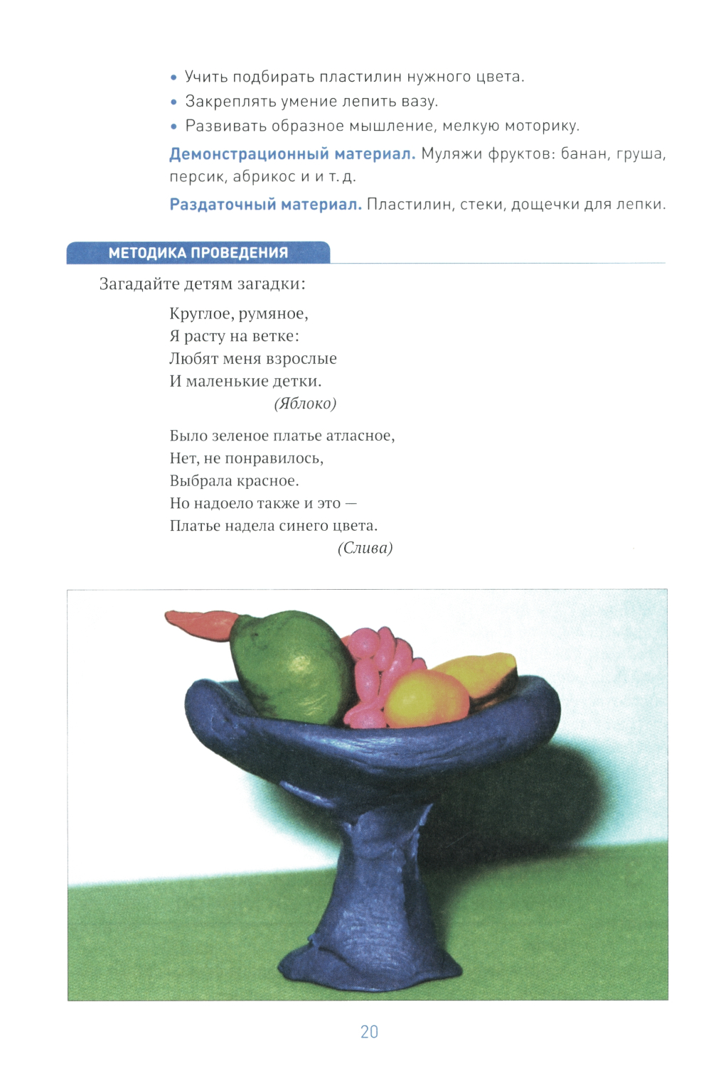 В пособии представлены конспекты увлекательных занятий с детьми 5-6 лет по лепке из глины и пластилина с использованием дополнительного материала. Занятия по изобразительной деятельности составлены по тематическому принципу: одна и та же тема объединяет все занятия по лепке, аппликации, рисованию в течение недели. Дети 5-6 лет на занятиях по изобразительной деятельности знакомятся с разными видами искусства, живо воспринимают образ в живописи, декоративных промыслах, скульптуре, графике. Закрепляются ранее приобретенные изобразительные умения и навыки. Занятия способствуют формированию у дошкольников самостоятельности, настойчивости, аккуратности, умения доводить работу до конца.