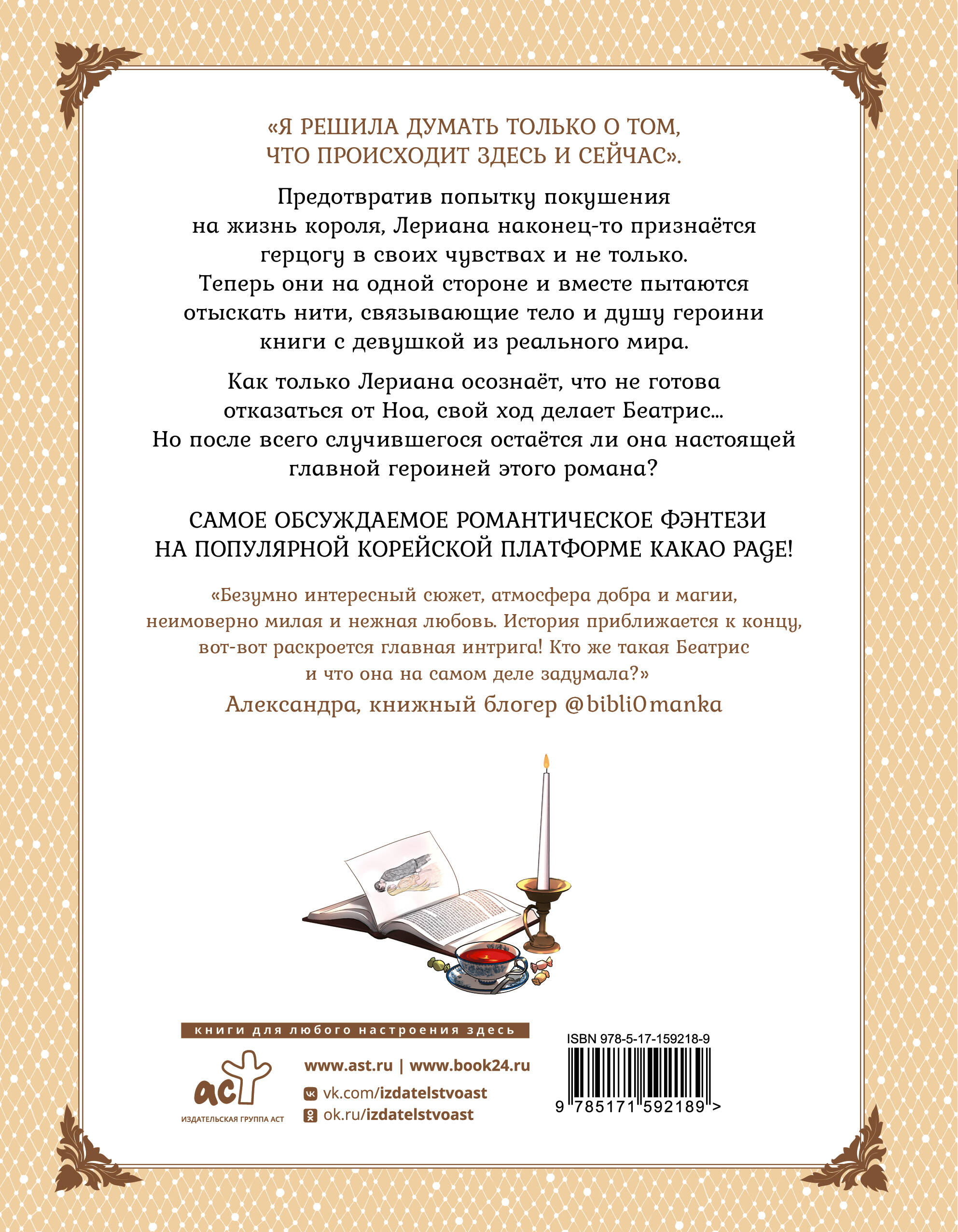 - Продолжение самого обсуждаемого романтического фэнтези на популярной корейской платформе Kakaopage. - Понравится поклонникам романтики, магии и исекая (историй про перерождение). Полюбившаяся многим история близится к финалу. Самое время насладиться атмосферой романтики, понаблюдать за отношениями Лерианы и ее возлюбленного и гадать, что скрывает Беатрис. Интрига скоро раскроется!| Издательство | Издательство "АСТ" |