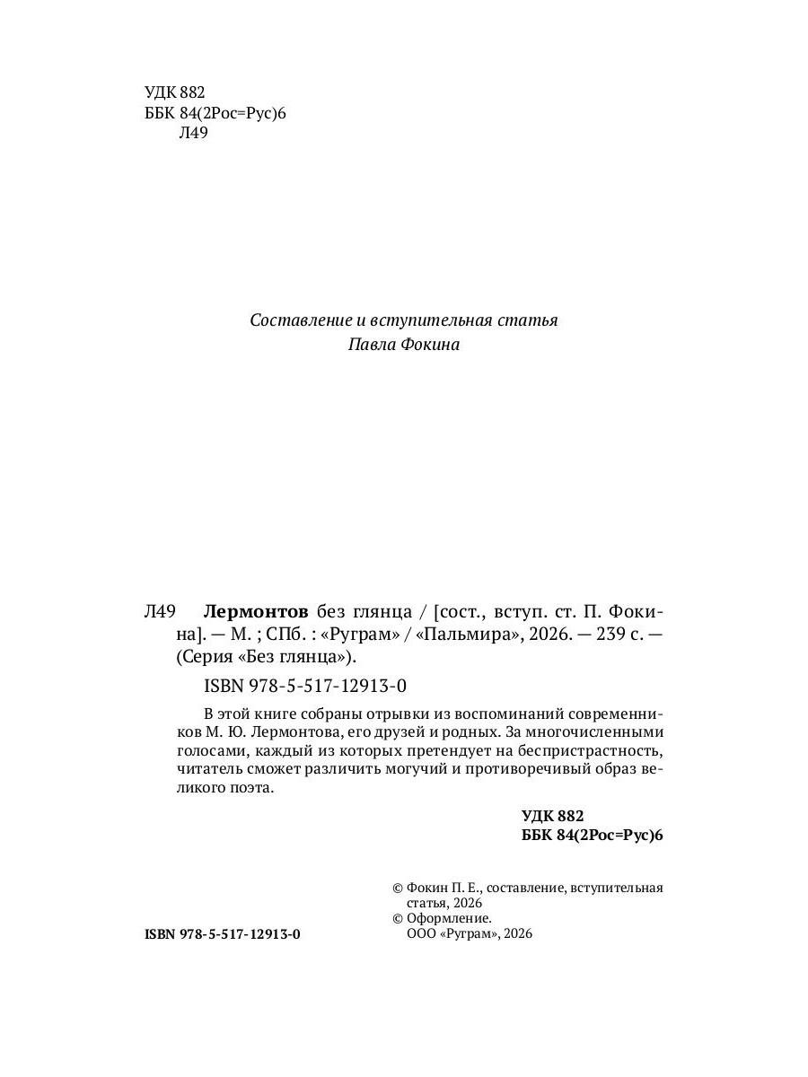 В этой книге собраны отрывки из воспоминаний современников М. Ю. Лермонтова, его друзей и родных. За многочисленными голосами, каждый из которых претендует на беспристрастность, читатель сможет различить могучий и противоречивый образ великого поэта.| Издательство | Т8 RUGRAM |
