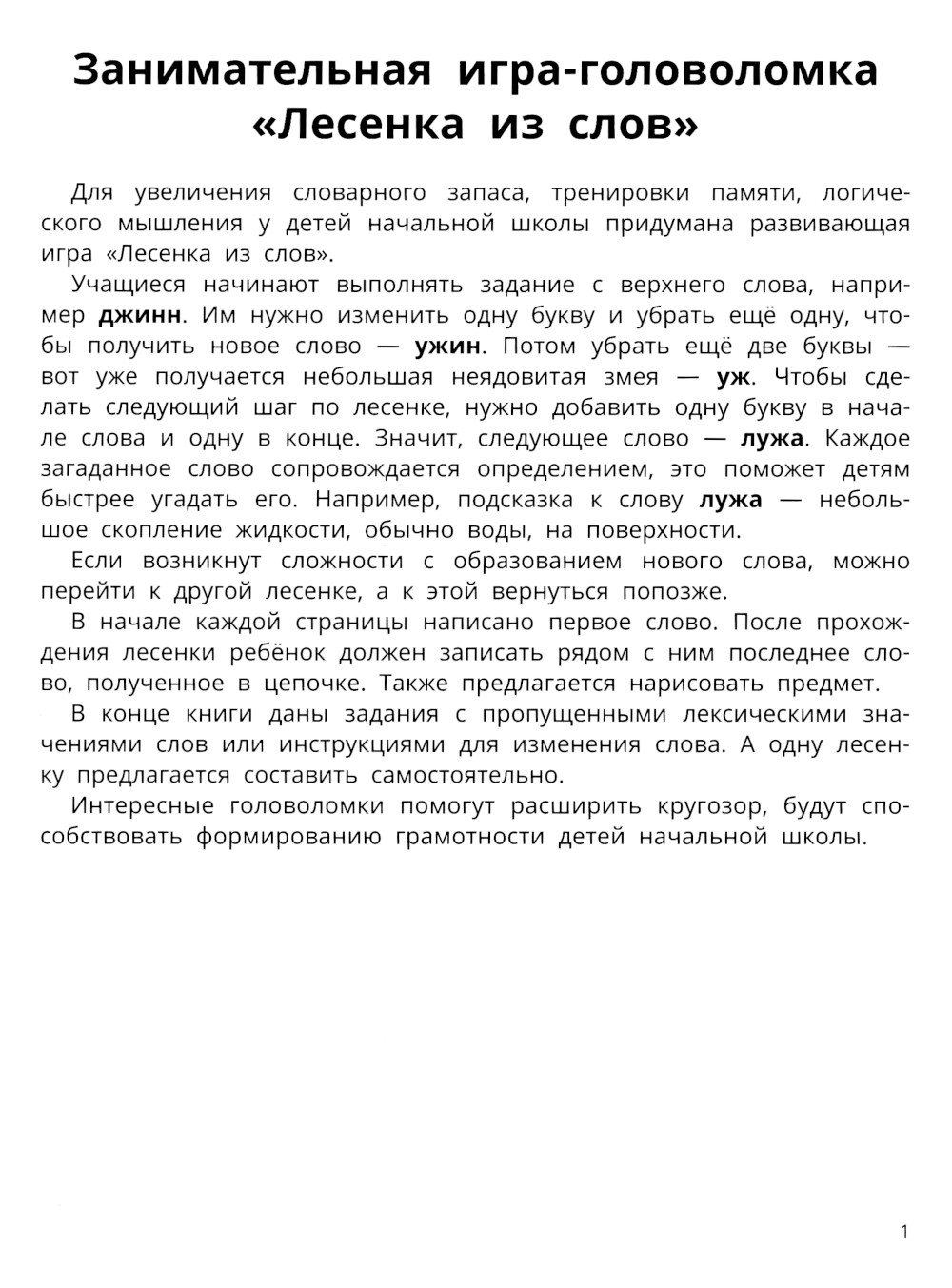 Занимательные головоломки для учащихся начальной школы «Лесенки из слов» поспособствуют расширению словарного запаса учащихся и помогут разнообразить задания в ходе учебного процесса. Движение по лесенке начинается сверху. Дети заменяют, переставляют, добавляют буквы и слоги, получают новые слова, опираясь на указанные лексические значения. Книга предназначена для учеников младших классов, их родителей и учителей.| Издательство | Феникс |