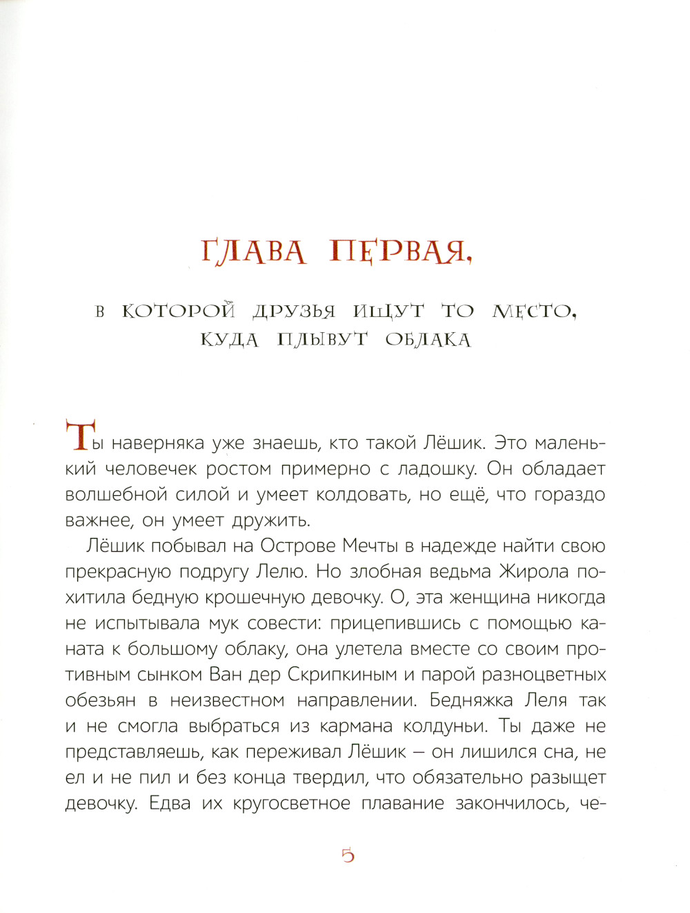 Кто такой Лёшик? Это маленький человечек, который запросто поместится на ладошке. Но самое замечательное не то, что он крошечный, и даже не то, что он умеет колдовать. Лёшик знает, что такое настоящая дружба, - и это многого стоит! Именно дружба и отзывчивость позволяют творить настоящие чудеса! Вместе с верными товарищами вороной Карлушей, котом Мурзиком, псом Жеком и старцем Гелором маленький человечек отправляется по отвесной скале высоко к небесам, чтобы в Заоблачной стране раскрыть старую семейную тайну и найти свою подругу Лелю. Развеет ли Лёшик чары злой колдуньи Жиролы, или ей снова удастся скрыться? Для младшего школьного возраста.