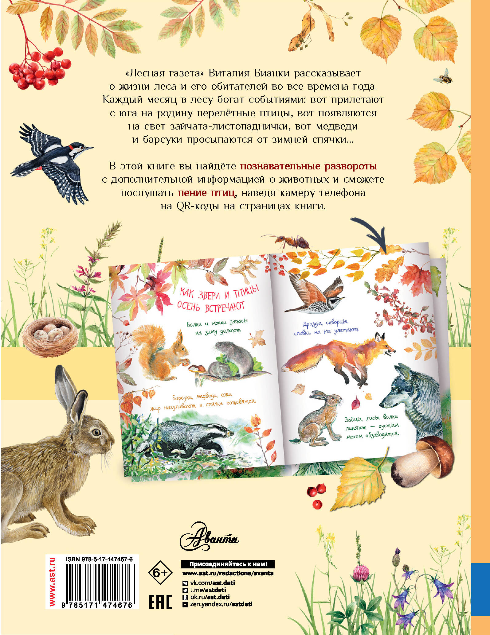 Книга Виталия Бианки "Лесная газета" расскажет о том, как живут лесные звери и птицы в течение всего года: как готовятся к зиме, когда вьют гнёзда, когда наступает месяц игр и плясок, кто в лесу по чужим закромам шарит и разбойничает... Рассказы русского классика дополняют акварельные иллюстрации современных художников и познавательные развороты с интересной информацией о животных, сделанные специально для детей. А если навести телефон на QR-коды на страницах книги, можно услышать пение лесных птиц. Для младшего школьного возраста.| Издательство | АСТ |