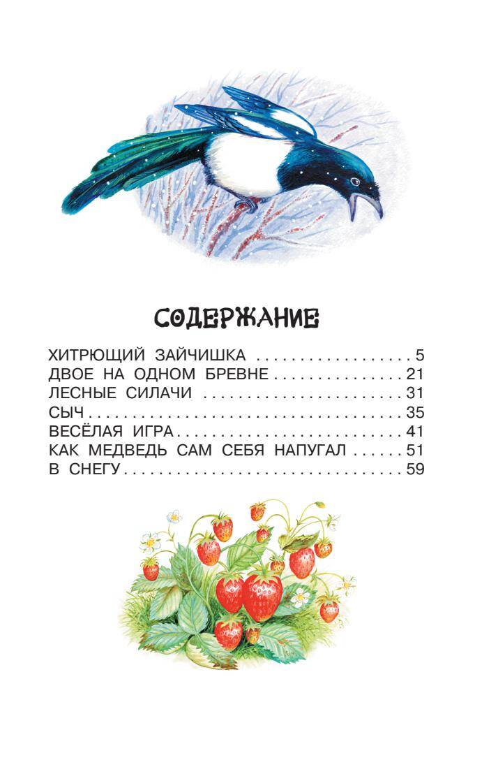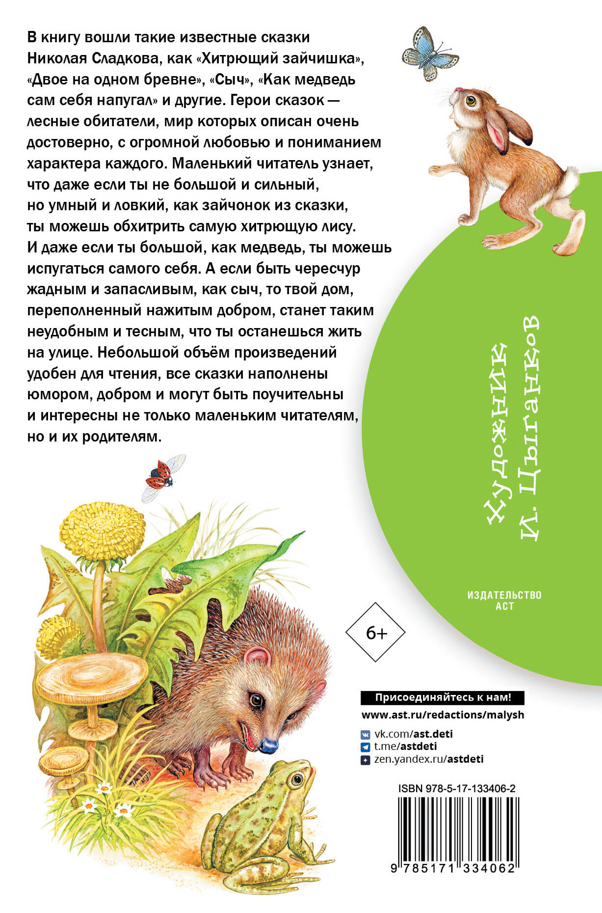В книгу вошли такие известные сказки Николая Сладкова, как «Хитрющий зайчишка», «Двое на одном бревне», «Сыч», «Как медведь сам себя напугал» и другие. Герои сказок - лесные обитатели, мир которых описан очень достоверно, с огромной любовью и пониманием характера каждого. Маленький читатель узнает, что даже если ты не большой и сильный, но умный и ловкий, как зайчонок из сказки, ты можешь обхитрить самую хитрющую лису. И даже если ты большой, как медведь, ты можешь испугаться самого себя. А если быть чересчур жадным и запасливым, как сыч, то твой дом, переполненный нажитым добром, станет таким неудобным и тесным, что ты останешься жить на улице. Небольшой объём произведений удобен для чтения, все сказки наполнены юмором, добром и могут быть поучительны и интересны не только маленьким читателям, но и их родителям.| Издательство | ИЗДАТЕЛЬСТВО "АСТ" |