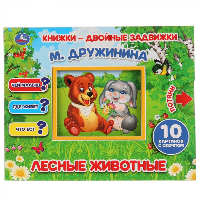 Книжка с двойными задвижками в весёлой игровой форме разовьёт внимание, память и логическое мышление ребёнка. Замечательные стихи Марины Дружининой познакомят малыша с лесными животными. Малыш будет с удовольствием рассматривать яркие страницы, слушать стихи, выполнять задания и играть с задвижками.