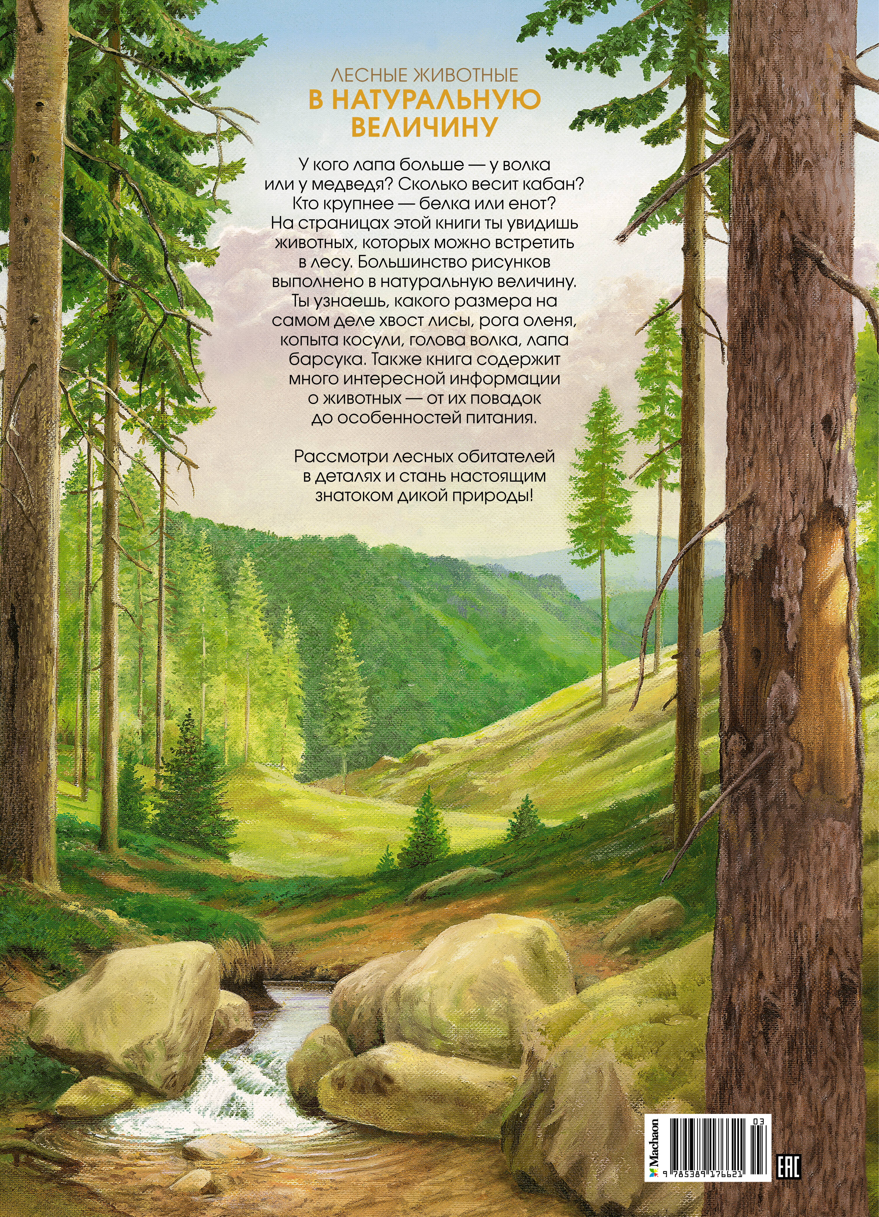 У кого лапа больше - у волка или у медведя? Сколько весит кабан? Кто крупнее - белка или енот? На страницах этой книги ты увидишь животных, которых можно встретить в лесу. Большинство рисунков выполнено в натуральную величину. Ты узнаешь, какого размера на самом деле хвост лисы, рога оленя, копыта косули, голова волка, лапа барсука. Также книга содержит много интересной информации о животных - от их повадок до особенностей питания. Рассмотри лесных обитателей в деталях и стань настоящим знатоком дикой природы!| Издательство | Азбука-Аттикус Издат.группа ООО |