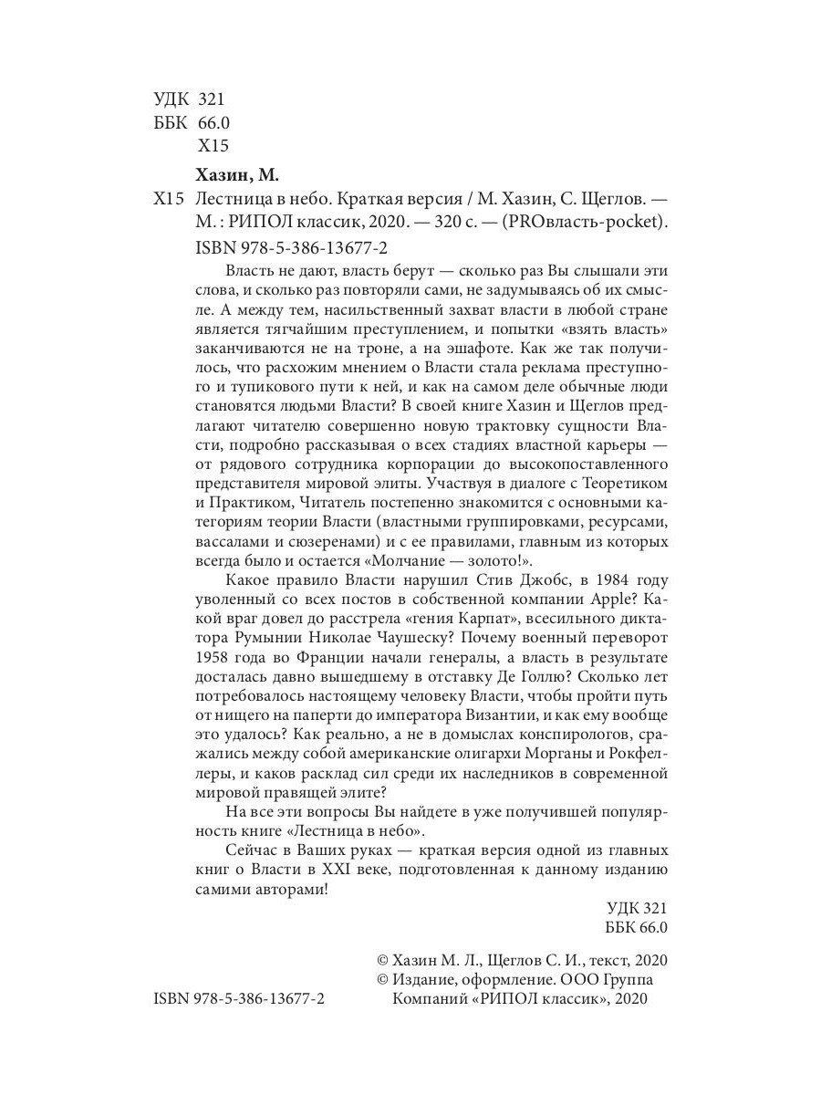 Власть не дают, власть берут - сколько раз Вы слышали эти слова, и сколько раз повторяли сами, не задумываясь об их смысле. А между тем, насильственный захват власти в любой стране является тягчайшим преступлением, и попытки «взять власть» заканчиваются не на троне, а на эшафоте. Как же так получилось, что расхожим мнением о Власти стала реклама преступного и тупикового пути к ней, и как на самом деле обычные люди становятся людьми Власти? В своей книге Хазин и Щеглов предлагают читателю совершенно новую трактовку сущности Власти, подробно рассказывая о всех стадиях властной карьеры - от рядового сотрудника корпорации до высокопоставленного представителя мировой элиты. Участвуя в диалоге с Теоретиком и Практиком, Читатель постепенно знакомится с основными категориями теории Власти (властными группировками, ресурсами, вассалами и сюзеренами) и с ее правилами, главным из которых всегда было и остается «Молчание - золото!». Какое правило Власти нарушил Стив Джобс, в 1984 году уволенный со всех постов в собственной компании Apple? Какой враг довел до расстрела «гения Карпат», всесильного диктатора Румынии Николае Чаушеску? Почему военный переворот 1958 года во Франции начали генералы, а власть в результате досталась давно вышедшему в отставку Де Голлю? Сколько лет потребовалось настоящему человеку Власти, чтобы пройти путь от нищего на паперти до императора Византии, и как ему вообще это удалось? Как реально, а не в домыслах конспирологов, сражались между собой американские олигархи Морганы и Рокфеллеры, и каков расклад сил среди их наследников в современной мировой правящей элите? На все эти вопросы Вы найдете в уже получившей популярность книге «Лестница в небо». Сейчас в Ваших руках - краткая версия одной из главных книг о Власти в XXI веке, подготовленная к данному изданию самими авторами!| Издательство | Рипол Классик |