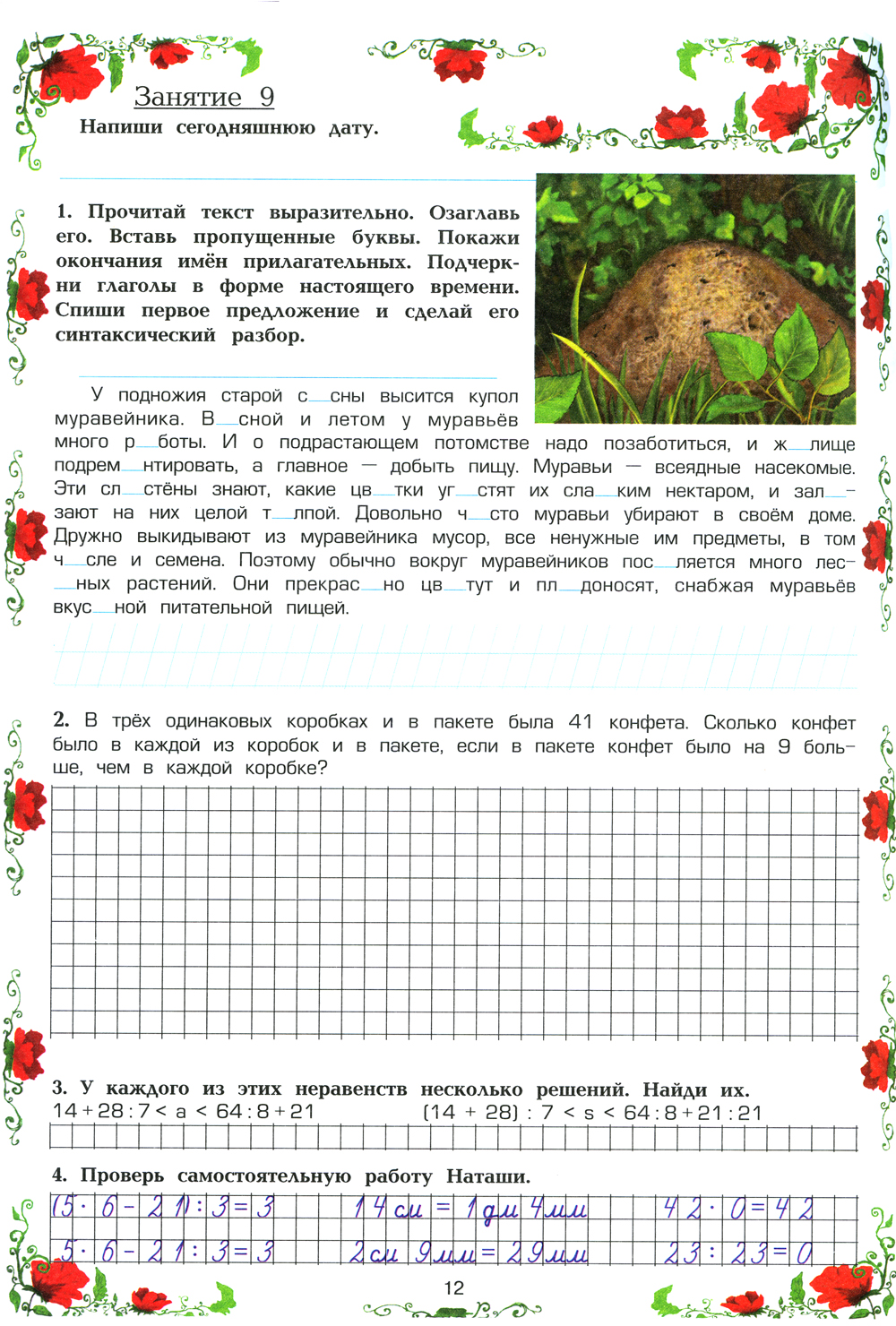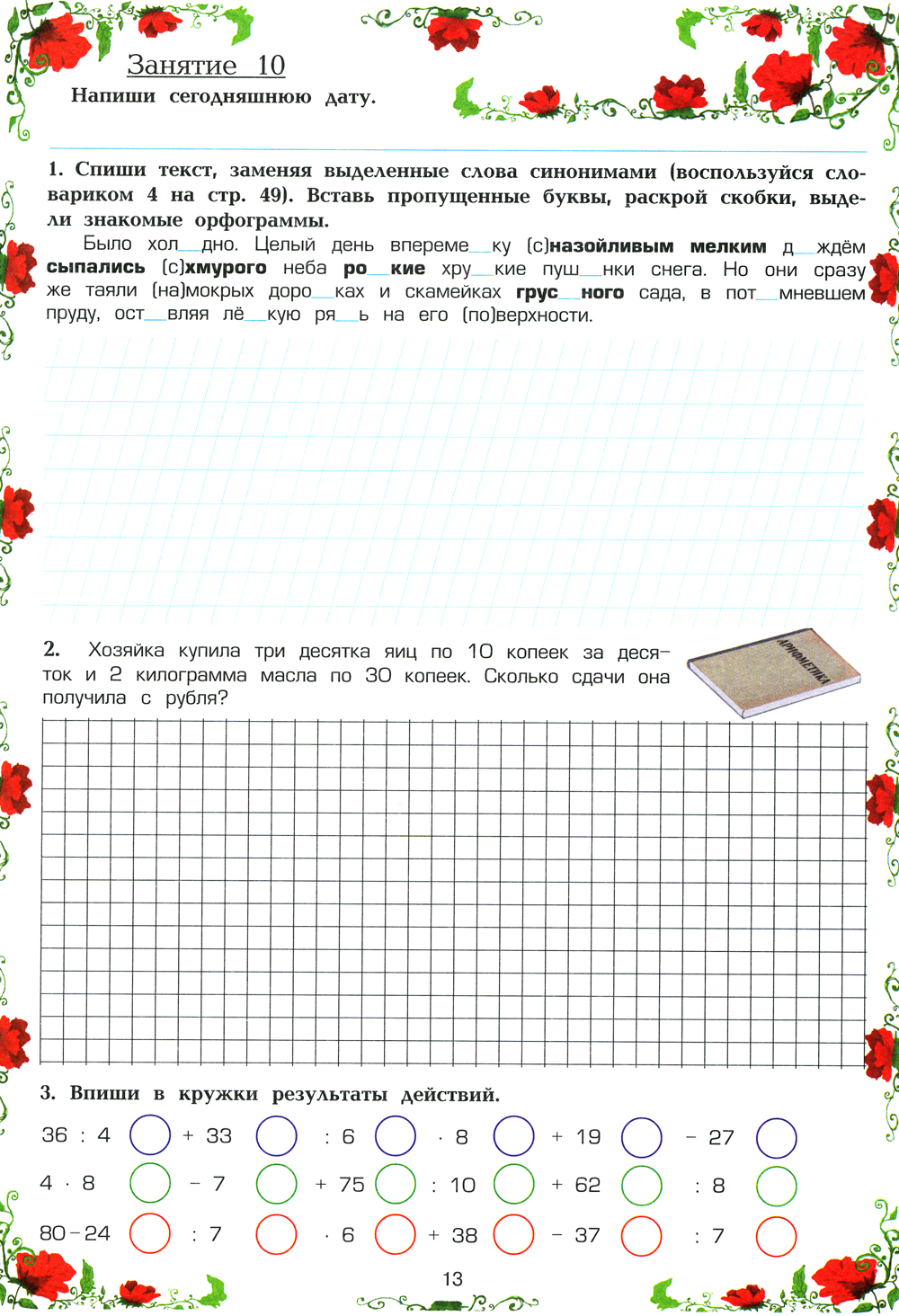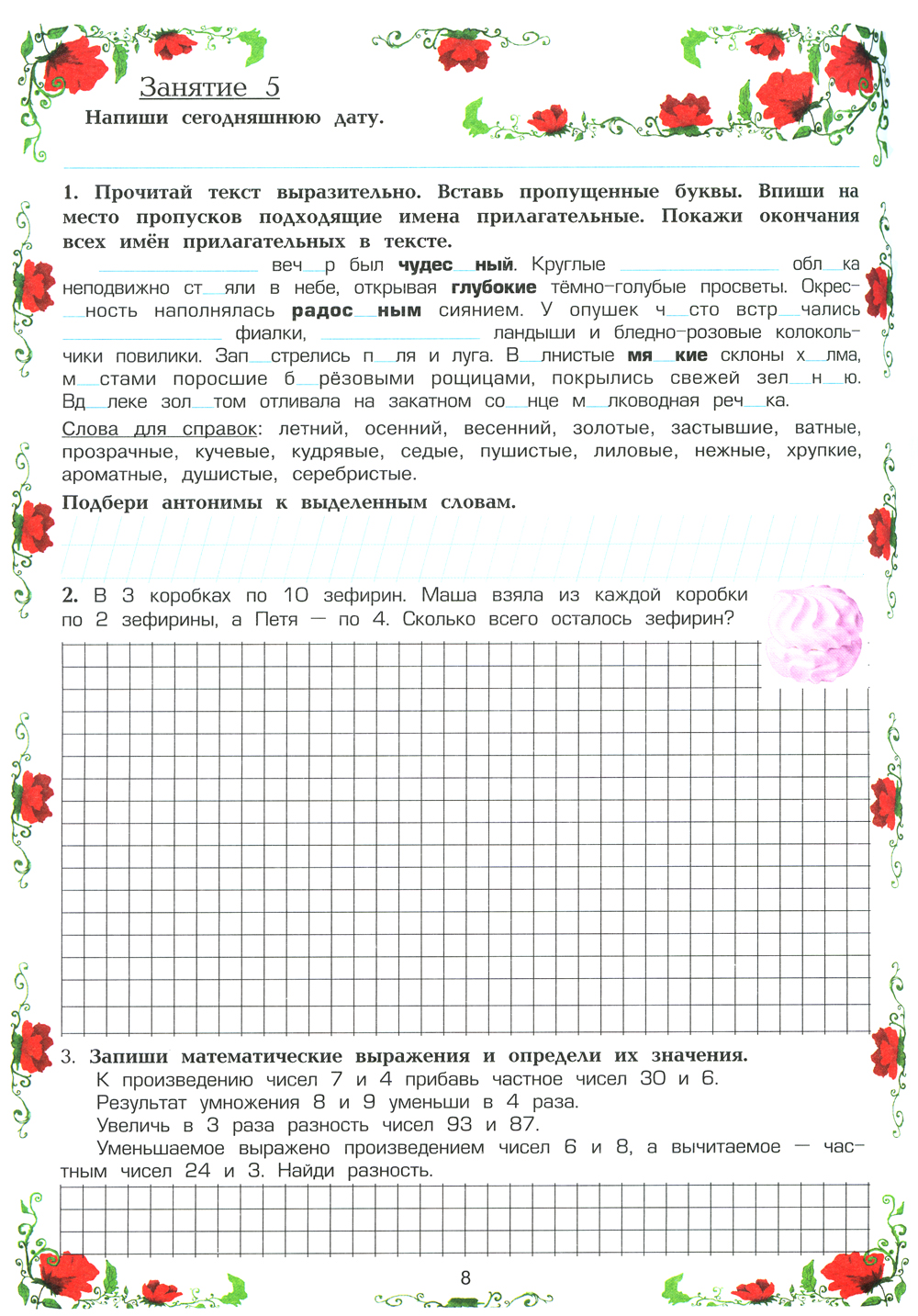 Теперь как опытные родители школьников вы наверняка убедились, что с детьми во время летних каникул обязательно нужно заниматься. Во-первых, дети ничего не забудут и будут спокойно и уверенно чувствовать себя в следующем классе. Во-вторых, это полезно и с воспитательной точки зрения. Абсолютное безделье ещё никому не приносило пользы. «Летняя гимназия на дому» содержит материал, который даст возможность ребёнку регулярно и без особого напряжения повторять всё изученное во втором классе. В пособии 45 занятий. Следовательно, заниматься по нему нужно через день. А в свободный от этого пособия день я бы посоветовала читать те книги, которые учительница задала вам на лето (если будет возможность, книги из списка читайте каждый день!). В пособии нет достаточно больших текстов для чтения, но у вас есть книги, которые нужно прочитать за лето.| Издательство | Грамотей |