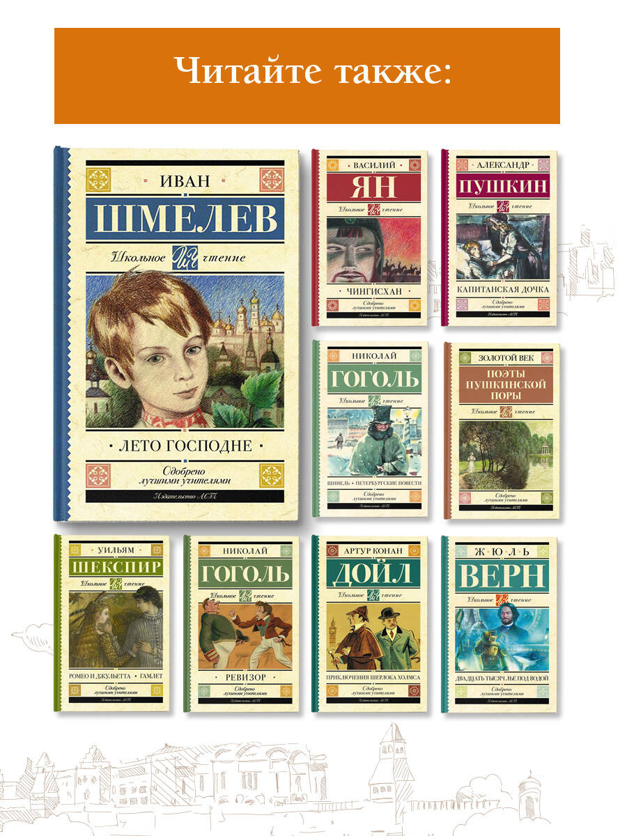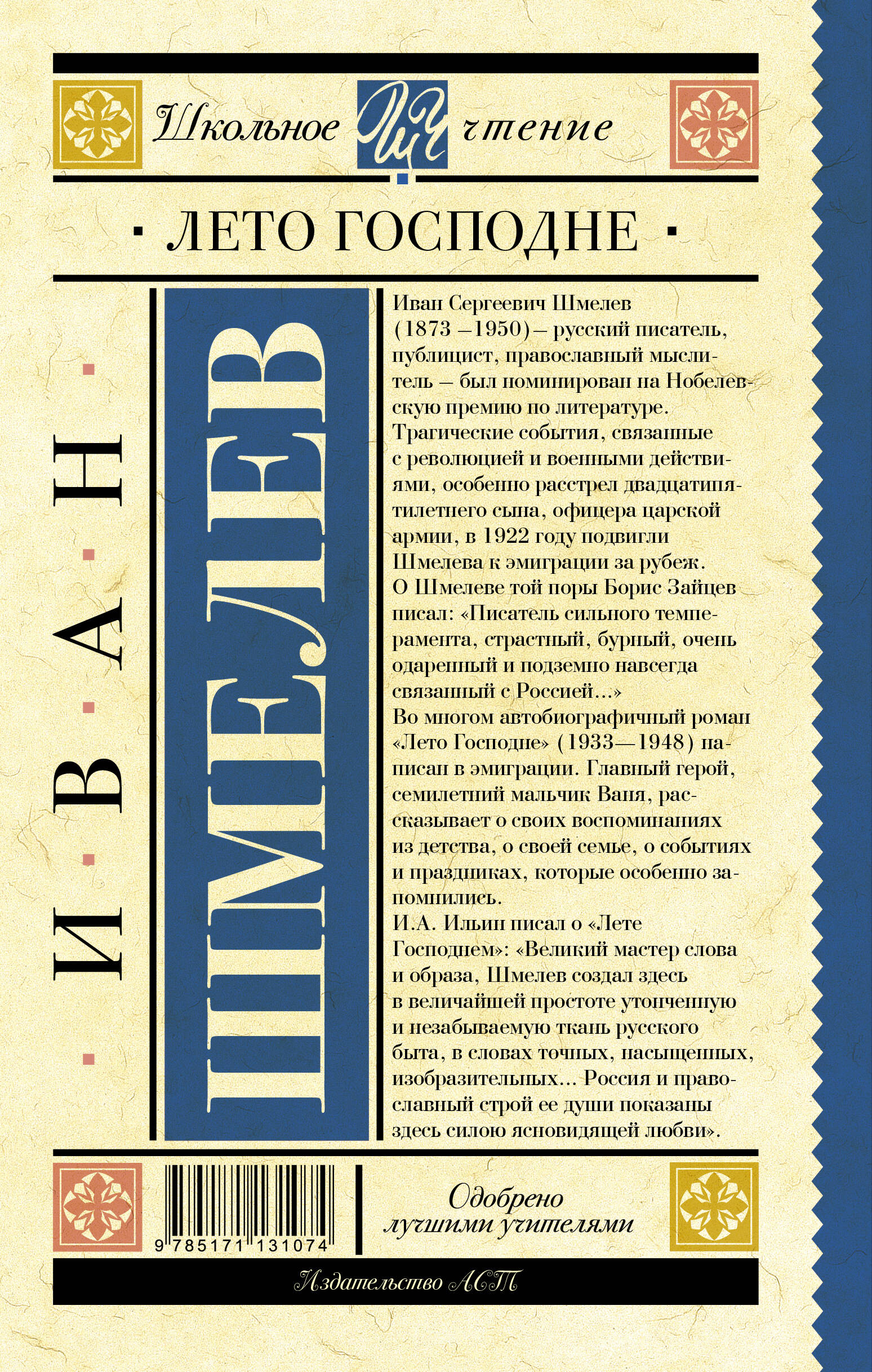 Иван Сергеевич Шмелев (1873-1950) - русский писатель, публицист, православный мыслитель, был номинирован на Нобелевскую премию по литературе. Трагические события, связанные с революцией и военными событиями, особенно расстрел двадцатипятилетнего сына, офицера царской армии, в 1922 году подвигли Шмелева к эмиграции за рубеж. О Шмелеве той поры Борис Зайцев писал: "Писатель сильного темперамента, страстный, бурный, очень одаренный и подземно навсегда связанный с Россией…" Во многом автобиографичный роман "Лето Господне" (1933-1948) написан в эмиграции. Главный герой, семилетний мальчик Ваня, рассказывает о своих воспоминаниях из детства, о своей семье, о событиях и праздниках, которые особенно запомнились. И.А. Ильин писал о "Лете Господнем": "Великий мастер слова и образа, Шмелев создал здесь в величайшей простоте утонченную и незабываемую ткань русского быта, в словах точных, насыщенных, изобразительных… Россия и православный строй ее души показаны здесь силою ясновидящей любви".| Издательство | ИЗДАТЕЛЬСТВО "АСТ" |
