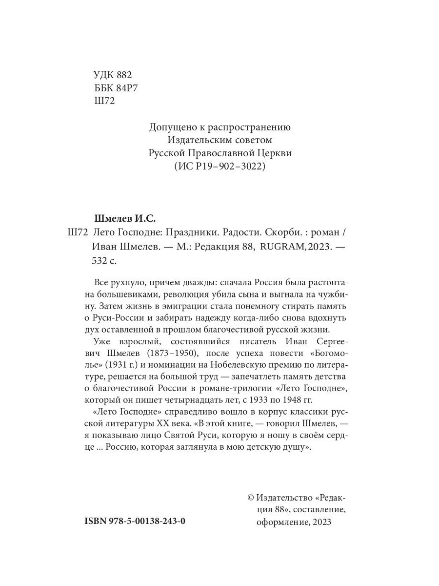 «Лето Господне» справедливо вошло в корпус классики русской литературы XX века. «В этой книге, - говорил Шмелев,- я показываю лицо Святой Руси, которую я ношу в своём сердце… Россию, которая заглянула в мою детскую душу».