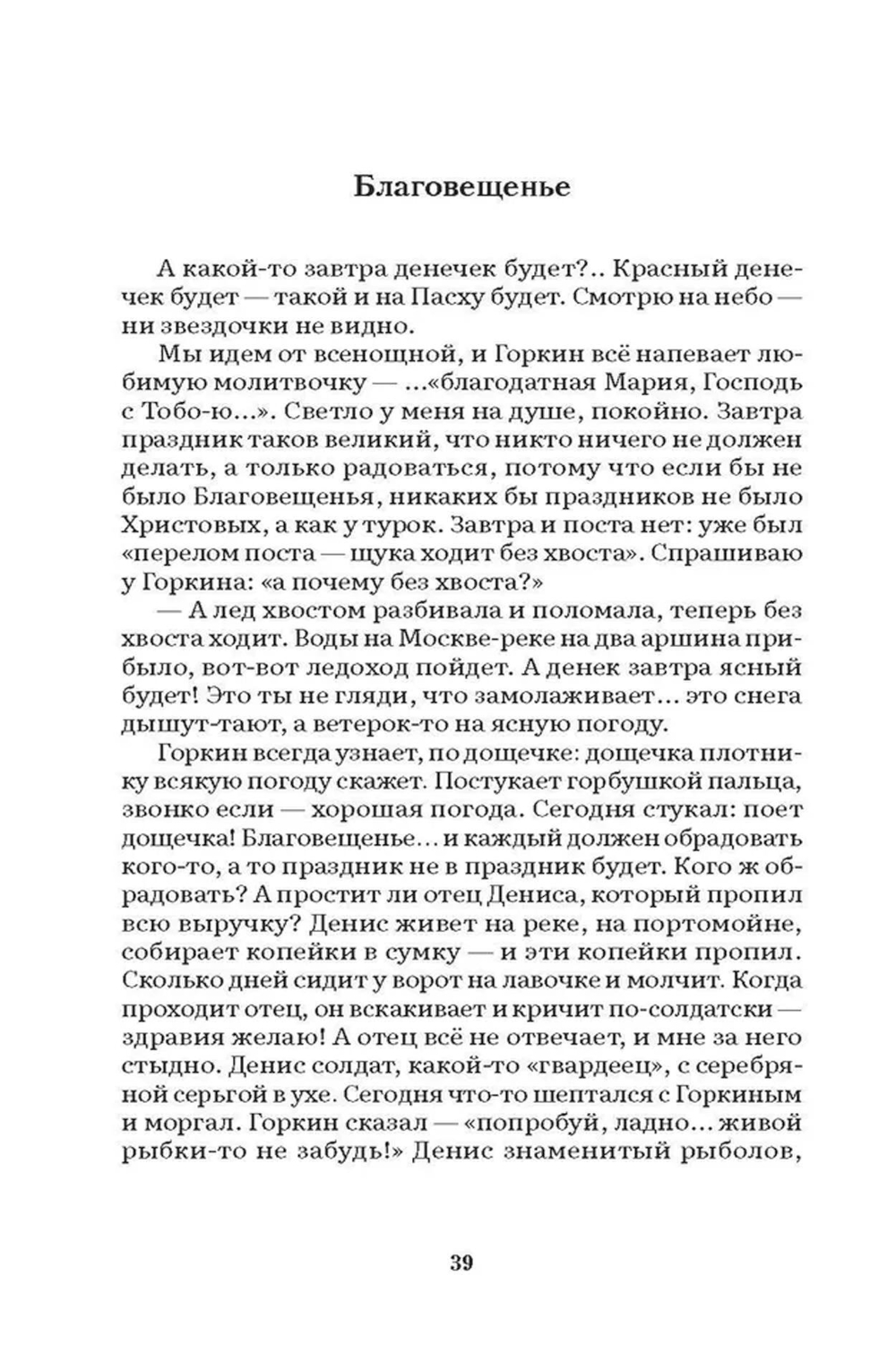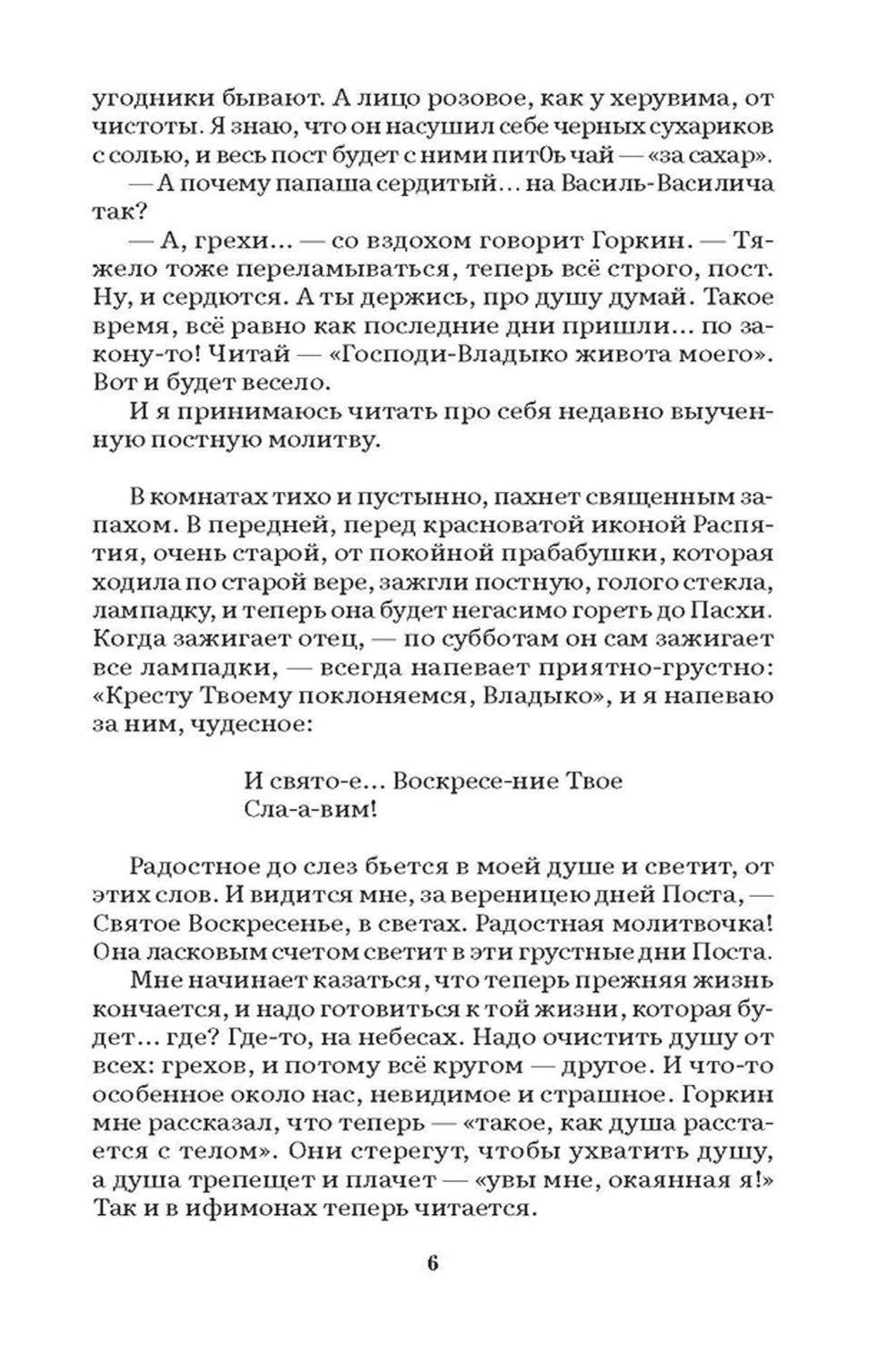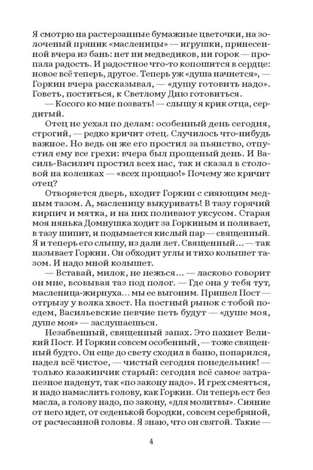 «Лето Господне» - автобиографическое произведение, в котором глазами маленького мальчика описывается быт купеческой семьи. Ваня - живой и веселый ребенок. Он живет с ощущением радости, наслаждаясь каждым мгновением, проведенным в своем уютном патриархальном мирке: молитвочками, приятными запахами, вкусной едой, объятиями отца и гулким колокольным звоном из соседних церквей. Жизнь Ванюши течет размеренно, плавно. Все ритуалы повторяются из года в год. Во время Великого поста запасают на лето лед, на Спас-Преображение собирают яблоки, в канун Ивана Постного солят огурцы, а после Воздвижения рубят капусту. По словам Ильина, изображенное в романе Шмелёва - не то, что «было и прошло», а то, что «есть и пребудет… Это сама духовная ткань верующей России. Это - дух нашего народа».| Издательство | Проспект |