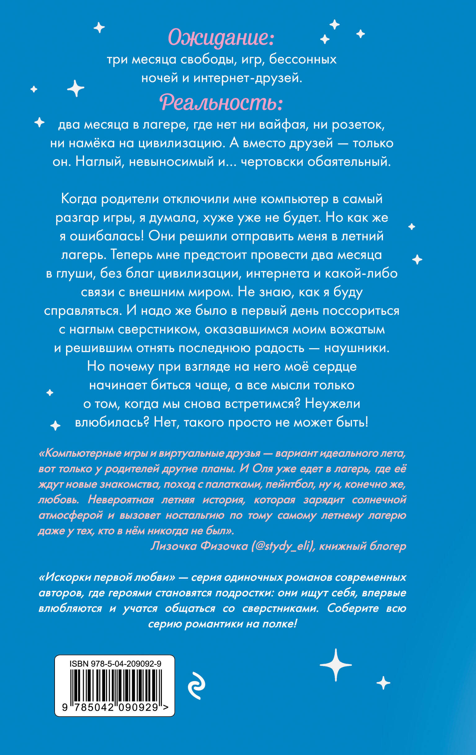 Новинка в серии одиночных романтических историй российских авторов «Искорки первой любви»! Вас ждет легкая и уютная история о первых чувствах, возникших в летнем лагере. Роман напомнит вам фильм «Лето, одноклассники, любовь», а также роман Аси Лавринович «В поисках сокровища». Когда родители отключили мне компьютер в самый разгар игры, я думала, хуже уже не будет. Но как же я ошибалась! Они решили отправить меня в летний лагерь. Теперь мне предстоит провести два месяца в глуши, без благ цивилизации, Интернета и какой-либо связи с внешним миром. Не знаю, как я буду справляться. И надо же было в первый день поссориться с наглым сверстником, оказавшимся моим вожатым и решившим отнять последнюю радость - наушники. Но почему при взгляде на него мое сердце начинает биться чаще? А все мысли только о том, когда мы снова встретимся? Неужели влюбилась? Нет, такого просто не может быть! Невероятной красоты серия историй любви, которая украсит вашу полку. В оформлении использована фольга и сверкающий лак с вкраплениями ярких блесток! Собери всю коллекцию романтики! Книги серии можно узнать по розовым сердечкам на корешке: - «Только попробуй влюбиться» Аксинья Карпова; - «Выбирай сердцем» Лия Болотова; - «Недотрога и хулиган» Ирина Молчанова; - «Лето моей любви» Наталья Миловицкая, Ольга Коробкова. Прочтите роман «Лето моей любви», если вам понравились «В поисках сокровища», «Только попробуй уйти» и «Все из-за тебя» Аси Лавринович, «Ворон» Эмилии Грин, «Майское лето» Зины Кузнецовой, «Притворись бабочкой» Тории Грин, «Артур, Луи и Адель» и «Шестое чувство» Даны Делон.| Издательство | ООО "Издательство "Эксмо" |