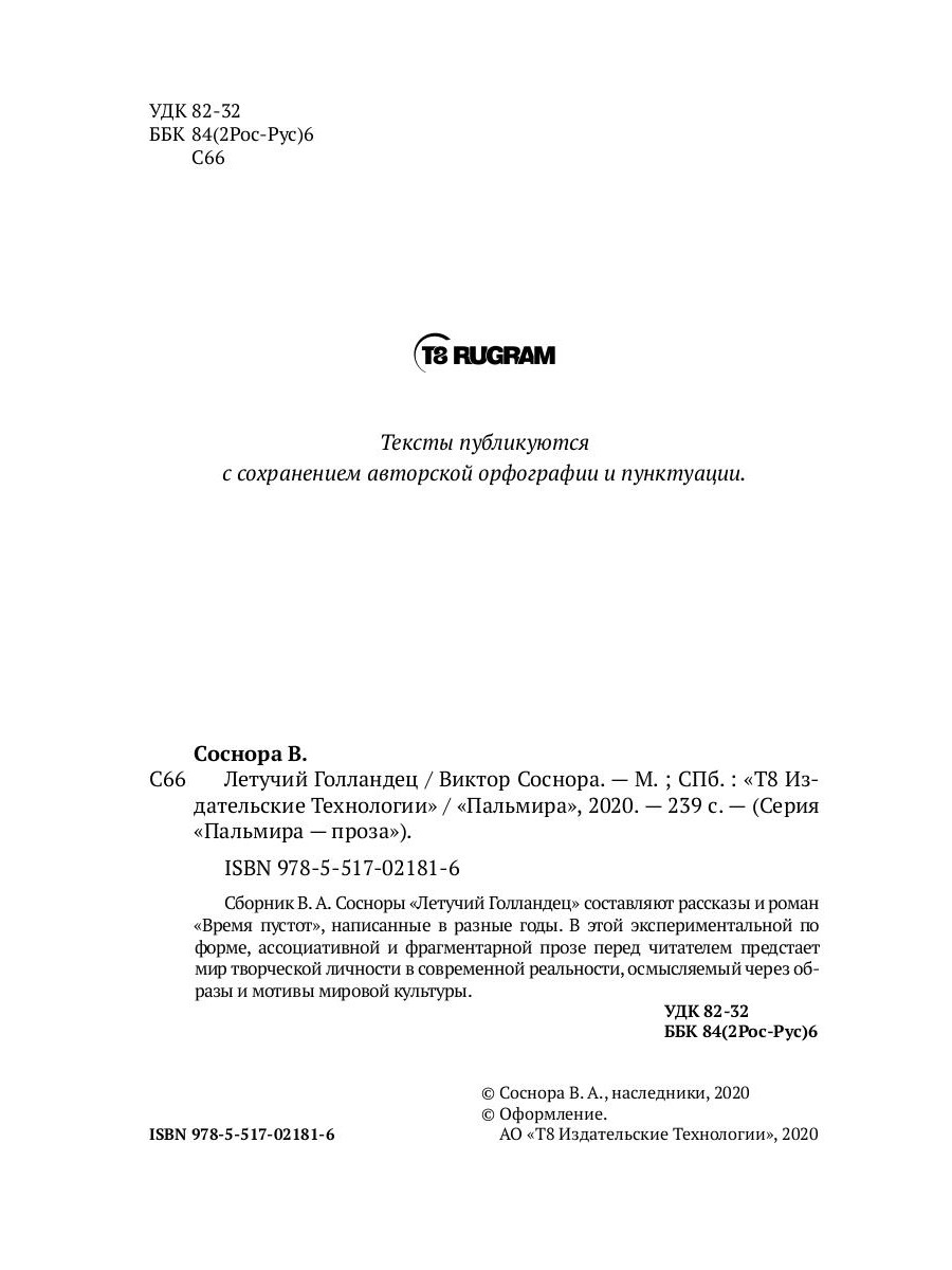 Сборник В.А. Сосноры «Летучий Голландец» составляют рассказы и роман «Время пустот», написанные в разные годы. В этой экспериментальной по форме, ассоциативной и фрагментарной прозе перед читателем предстает мир творческой личности в современной реальности, осмысляемый через образы и мотивы мировой культуры.