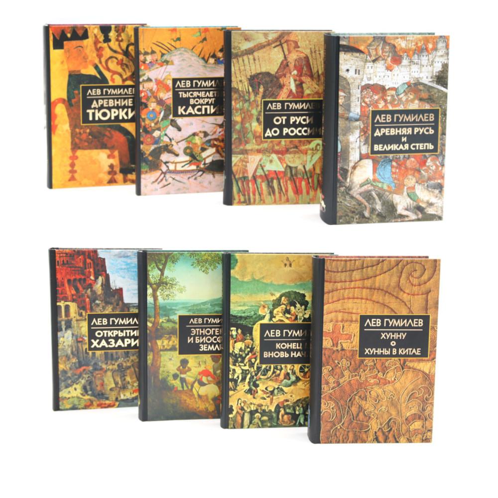 Комплект из 8 книг: «Древние тюрки» Книга посвящена малоизученному периоду мировой истории VI-VIII вв. н. э., когда на просторах Евразии зародилась и расцвела держава древних тюрок - Великий Тюркский каганат. Детальный анализ этнических, политических и религиозных аспектов жизни этого государства сочетается в этом произведении с живой образной манерой изложения, что делает книгу весьма интересной для широкой читающей публики. «Древняя Русь и Великая степь» Книга известного русского историка, посвящена одной из самых сложных и запутанных проблем отечественной истории - вопросу взаимоотношений Древней Руси и ее соседей. Автор попробовал создать полную картину древнерусской и степной этнической истории, основанную на разработанной им пассионарной теории этногенеза. «Конец и вновь начало» Одна из самых популярных книг выдающегося отечественного историка и географа Л. Н. Гумилева написана на основе лекций, прочитанных автором в 80-е годы перед разными аудиториями Москвы и Ленинграда и пользовавшихся огромным успехом у всех, кто способен мыслить самостоятельно и творчески. Понятия оригинальной авторской теории пассионарности, объясняющей закономерности возникновения и развития этносов, гибели и крушения великих империй, изложены в увлекательной форме, на примерах из жизни многих народов античной и средневековой Европы, Ближнего Востока, Китая, Индии и Америки и деятельности их выдающихся представителей (пассионариев), оставивших яркий след в Истории. «От Руси до России» Книга выдающегося русского историка и географа Л. Н. Гумилева посвящена истории России от времен Рюрика до правления Петра I, причем все события и поступки исторических лиц объяснены с позиций разработанной автором пассионарной теории этногенеза. Книга написана живым, образным языком, очень увлекательно и доходчиво, поэтому огромный объем фактического материала усваивается без особых усилий со стороны читателя. Именно благодаря этим качествам книга была рекомендована Министерством образования России в качестве учебного пособия для учащихся старших классов средней школы. Истинные любители русской истории также получат немалое удовольствие от знакомства с этим неординарным произведением. «Открытие Хазарии» Книга Л. Н. Гумилева посвящена исследованию одной из самых темных страниц отечественной истории, а именно истории возникновения, расцвета и таинственного исчезновения с карты Евразии Хазарского каганата - соседа и соперника Древней Руси, находившегося в VIII-X веках н. э. в междуречье Волги, Дона и Терека. Сборник включает историко-географический этюд «Открытие Хазарии», написанный в жанре исторического детектива и увидевший свет в 1966 г., историческое эссе «Зигзаг истории» (1987 г.), рассказывающее об истории Хазарского каганата и ряд близких по тематике статей, изданных в период с 1962 по 1987 г. Книга написана живым, образным языком и станет настоящим подарком для тех, кто хочет познать тайны истории. «Тысячелетие вокруг Каспия» Книга выдающегося отечественного историка и географа Л. Н. Гумилева является дополнением к теоретическому трактату «Этногенез и биосфера Земли» и представляет собой глубокое этнологическое исследование ойкумены Евразии за период в 1500 лет. Автор раскрывает перед читателями малоизвестные страницы истории множества этносо