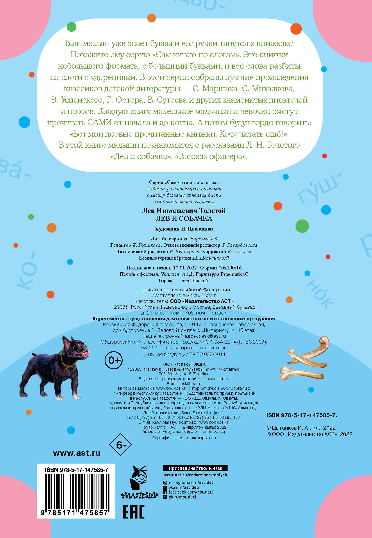 Крупный шрифт, разбивка на слоги, ударения, запоминающиеся цветные иллюстрации - в книгах серии "Сам читаю по слогам" есть всё необходимое для формирования у ребенк прочного навыка чтения и стимулирования устойчивого интеререса к книге. А еще это прекрасная возможность познакомиться с лучшими произвелениями любимых детских авторов, многие из которых стали неотъемлемой частью отечественной культуры. Знать их - признак образованного, культурного человека. Идеальное сочетание "цена-качество! Книги не будут обременительны для семейного бюджета и принесут массу пользы, создадут прекрасное настроение. Хрестоматийные рассказы Л. Н. Толстого "Лев и собачка", "Рассказ офицера" помогут ребенку понять, что такое верность и преданность, расширят палитру его чувств и эмоций, сделают его поведение более осознанным.| Издательство | АСТ |