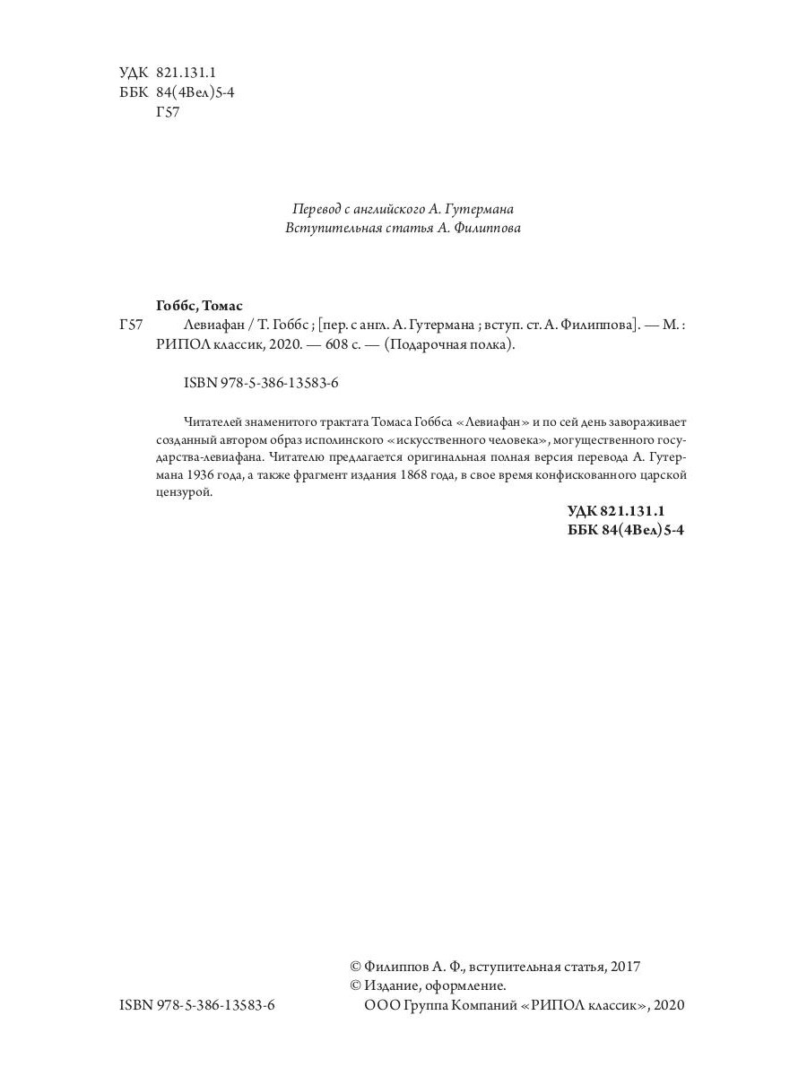 Читателей знаменитого трактата Томаса Гоббса «Левиафан» и по сей день завораживает созданный автором образ исполинского «искусственного человека», могущественного государства-левиафана. Читателю предлагается оригинальная полная версия перевода А. Гутермана 1936 года, а также фрагмент издания 1868 года, в свое время конфискованного царской цензурой.