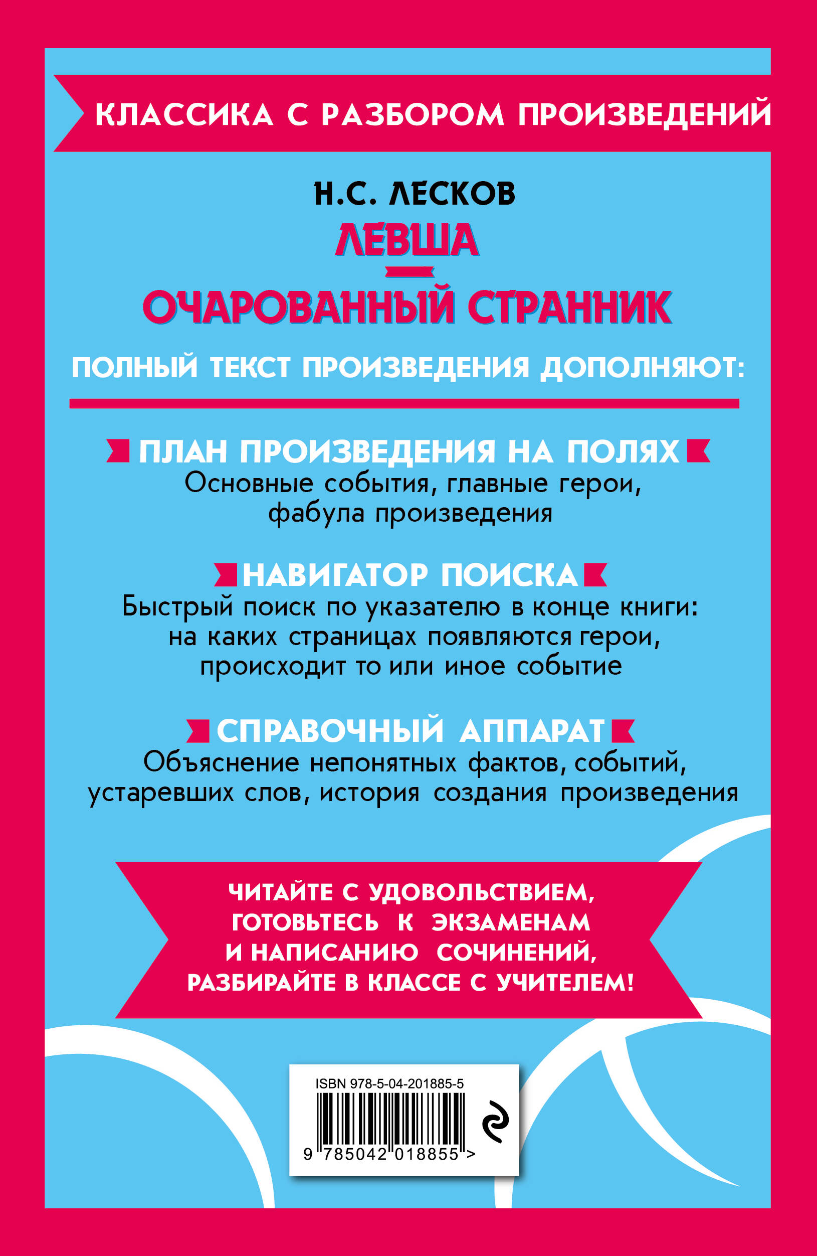 Н. С. Лесков - уникальный писатель, который в своих произведениях сумел раскрыть перед читателями всю глубину русской души. Яркими примерами его творчества являются повести «Левша» и «Очарованный странник», которые до сих пор пользуются большой популярностью как среди школьников, так и среди старших поколений. Новое издание этих произведений станет незаменимым помощником в подготовке к ЕГЭ, ОГЭ и урокам литературы. В нем вы найдете уникальные справочные материалы: заметки на полях для быстрого поиска нужного фрагмента, развернутые комментарии, где объясняются устаревшие слова и непонятные факты, историю создания произведений, указатель имен и событий. Все это поможет не только быстро и легко подготовиться к экзаменам, но и узнать новые факты, которые можно было упустить на уроке. В «Левше» рассказывается об одаренном умельце, простом тульском мастере, который смог подковать крошечную металлическую блоху, превзойдя тем самым английских мастеров. Повесть высмеивает гордость и превосходство высшего класса, показывая, что простой русский человек может быть не менее талантливым и изобретательным. «Очарованный странник» - повесть, которая знакомит читателя с добрым и простодушным монахом с внешностью былинного богатыря Иваном Флягиным. В ходе путешествия на пароходе он рассказывает своим попутчикам, сколько приключений, мук и испытаний он пережил, прежде чем покаялся и пришел к Богу.| Издательство | ООО "Издательство "Эксмо" |
