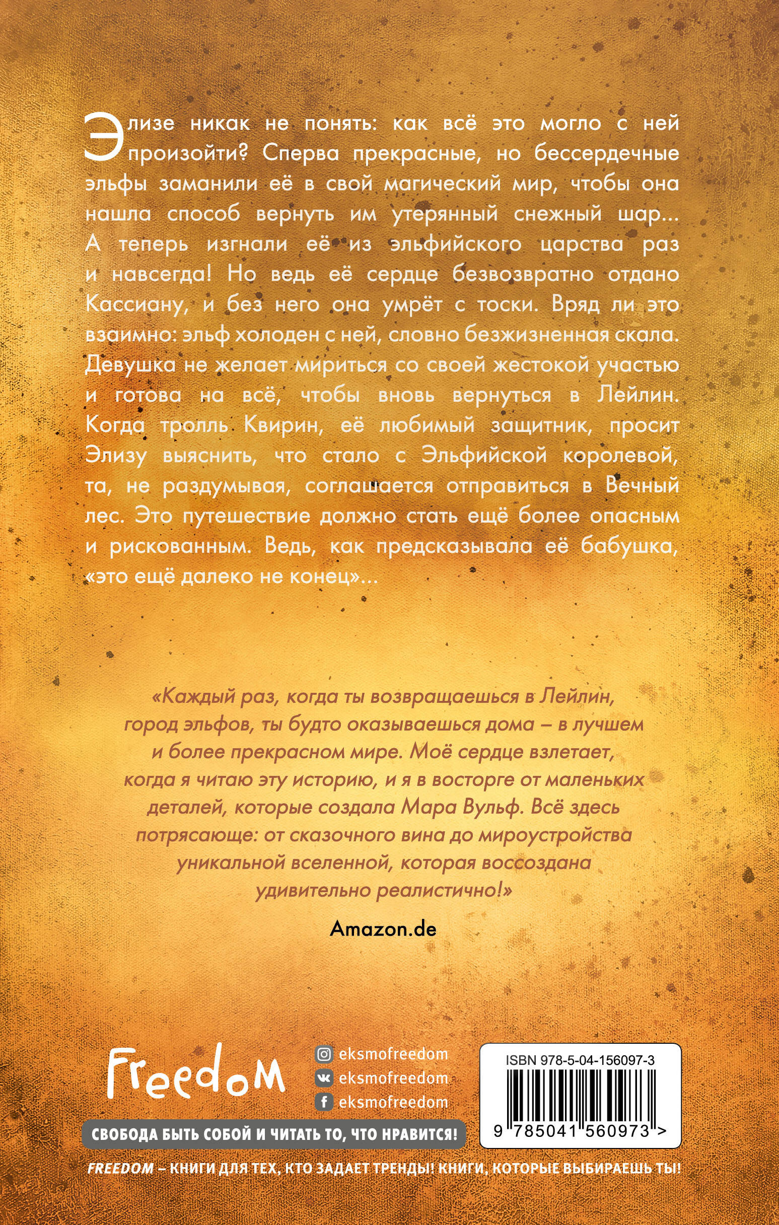 Элизе никак не понять: как все это могло с ней произойти? Сперва прекрасные, но бессердечные эльфы заманили ее в свой магический мир, чтобы она нашла способ вернуть им утерянный снежный шар… А теперь изгнали ее из эльфийского царства раз и навсегда! Но ведь ее сердце безвозвратно отдано Кассиану, и без него она умрет с тоски. Вряд ли это взаимно: эльф холоден с ней, словно безжизненная скала. Девушка не желает мириться со своей жестокой участью и готова на всё, чтобы вновь вернуться в Лейлин. Когда тролль Квирин, ее любимый защитник, просит Элизу выяснить, что стало с Эльфийской королевой, та, не раздумывая, соглашается отправиться в Вечный лес. Это путешествие должно стать еще более опасным и рискованным. Ведь как предсказывала ее бабушка, «это еще далеко не конец»… Цикл, который объединяет мир шелликотов из «Саги серебряного мира» с миром эльфов, но его можно читать независимо от нее! Невероятное оформление на мерцающей бумаге, а все семь корешков рядом создают сказочный коллаж. Собери всю коллекцию! Продолжение нового цикл от популярной немецкой писательницы Мары Вульф, который связан мироустройством с циклом «Сага серебряного мира». В нем вы вновь встретитесь с Эммой, Колламом, а еще вас ждут смелая Элиза и притягательный эльф Кассиан с непростым характером! Мир эльфов, такой чарующий и сложный, станет вашим новым увлечением, это точно! Мара Вульф - автор 25 бестселлеров! В ее новом цикле выйдет 7 потрясающих книг о сказочных созданиях, которых так все любят, - эльфах. Они тщеславны, заносчивы и упрямы. Но крайне обворожительны! Убедитесь сами! Как быть, если ты самая обычная школьница и так хочется новых приключений? Может, стоит обратить внимание на собственные сны, в которых так много загадок? Элиза так и сделала и открыла врата в удивительный мир, о существовании которого она не подозревала. Вот только что ждет ее там? Неужели она оказалась той самой избранной, чьей помощи так ждут невероятные эльфы? Мара Вульф вновь увлекает вас в прекрасный мир, в котором так легко заблудиться и так непросто вырваться из его сетей!| Издательство | ООО "Издательство "Эксмо" |