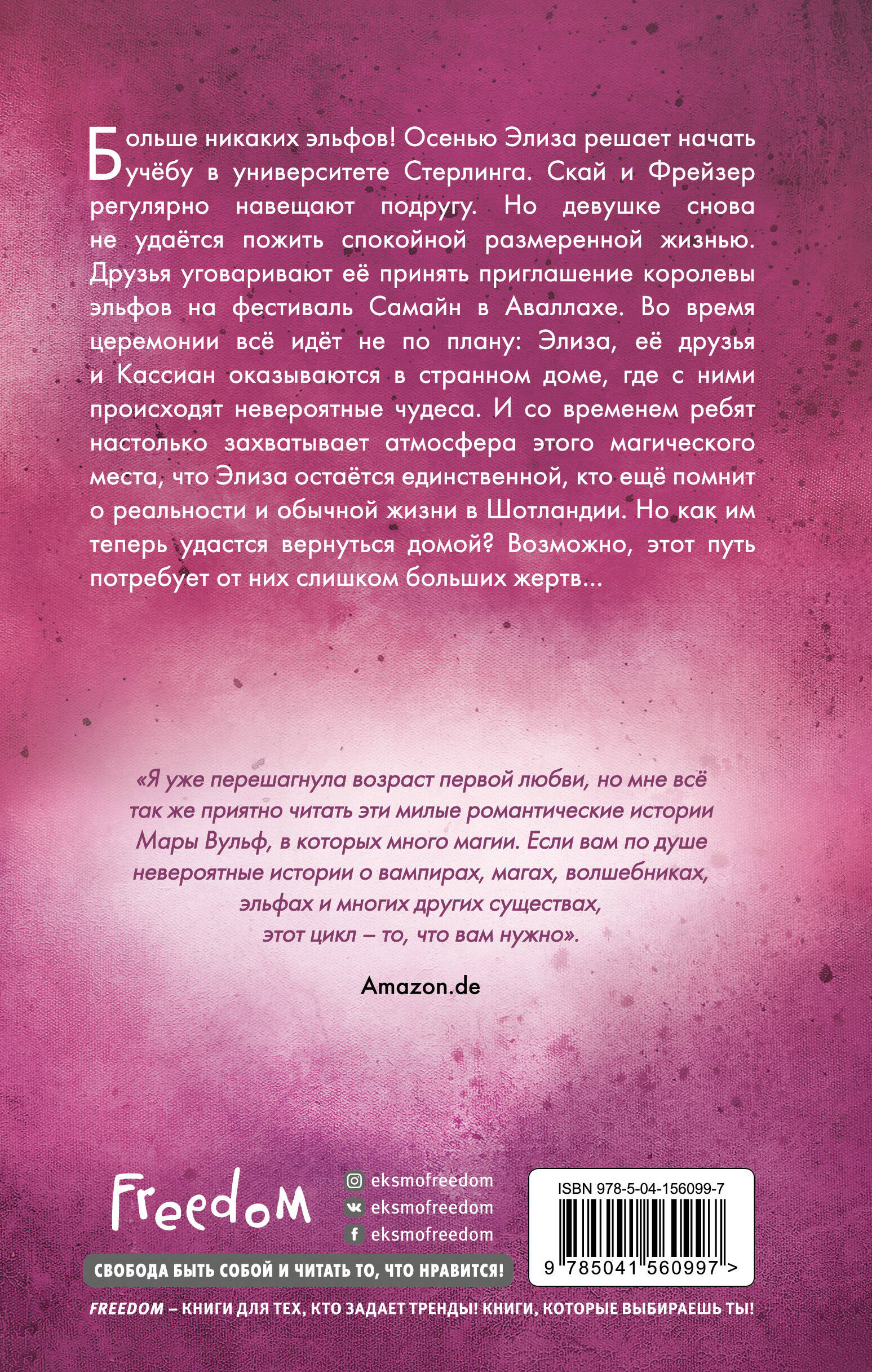 Больше никаких эльфов! Осенью Элиза решает начать учебу в университете Стерлинга. Скай и Фрейзер регулярно навещают подругу. Но девушке снова не удается пожить спокойной размеренной жизнью. Друзья уговаривают ее принять приглашение королевы эльфов на фестиваль Самайн в Аваллахе. Во время церемонии все идет не по плану: Элиза, ее друзья и Кассиан оказываются в странном доме, где с ними происходят невероятные чудеса. И со временем ребят настолько захватывает атмосфера этого магического места, что Элиза остается единственной, кто еще помнит о реальности и обычной жизни в Шотландии. Но как им теперь удастся вернуться домой? Возможно, этот путь потребует от них слишком больших жертв… Новая, еще более захватывающая часть цикла «Лёгкое пёрышко» об Элизе и Кассиане, эльфах, шелликотах, колдунах и других магических созданиях. В этой части девушка с друзьями и Кассианом попадет в необычный дом, в котором сбываются потаеннные мечты. Благо это или зло? И не утянет ли Аваллах навсегда друзей в свои сети? Детектив, триллер, романтическое фэнтези. В романе сочетаются многие жанры, но в любом случае, это красивая, яркая, насыщенная событиями сказка, которая позволит вам перенестись в мир эльфов, их эстетику и воплотит многие фантазии в реальность! «Книга приводит в восторг! Помимо Элизы и Кассиана, в ней раскрываются характеры других, ранее второстепенных персонажей, и это заставляет задуматься о многом. Элиза очаровательна, ее упрямство и неуверенность, ее доброе сердце и преданность близким, все это так мило. Если Кассиан не найдет в пятом томе способ исправить свое поведение, то он ее не заслуживает, это точно!» - Amazon.de Цикл, который объединяет мир шелликотов из «Саги серебряного мира» с миром эльфов, но его можно читать независимо от нее! В конце каждой книги - глоссарий с описанием персонажей. Невероятное оформление на мерцающей бумаге, а все семь корешков рядом создают сказочный коллаж. Собери всю коллекцию! Мара Вульф - автор 25 бестселлеров! В ее новом цикле выйдет 7 потрясающих книг о сказочных созданиях, которых так все любят, - эльфах. Они тщеславны, заносчивы и упрямы. Но крайне обворожительны! Убедитесь сами!| Издательство | Эксмо |