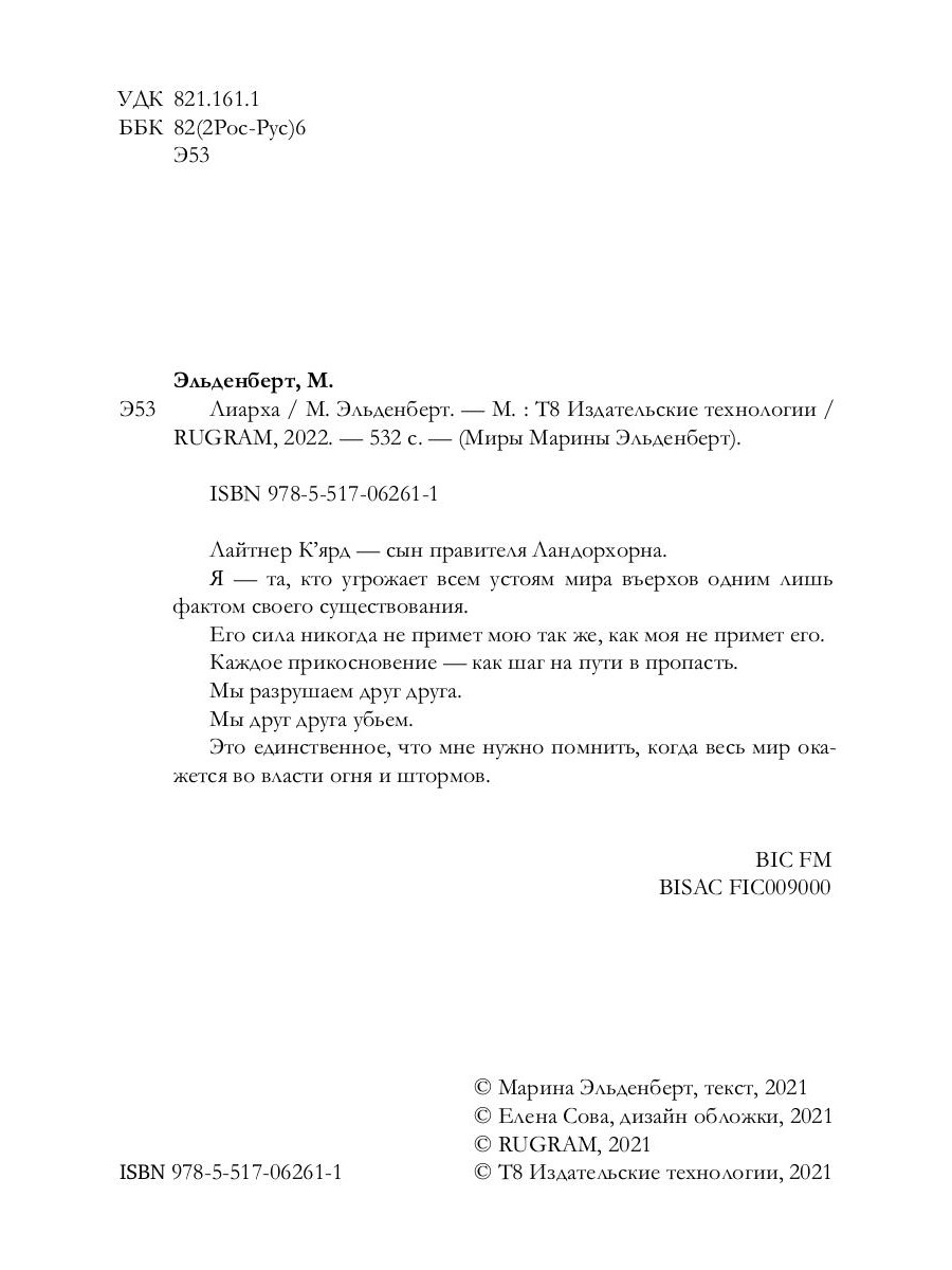 Лайтнер К'ярд - сын правителя Ландорхорна. Я - та, кто угрожает всем устоям мира въерхов одним лишь фактом своего существования. Его сила никогда не примет мою так же, как моя не примет его. Каждое прикосновение - как шаг на пути в пропасть. Мы разрушаем друг друга. Мы друг друга убьем. Это единственное, что мне нужно помнить, когда весь мир окажется во власти огня и штормов.| Издательство | Т8 RUGRAM |