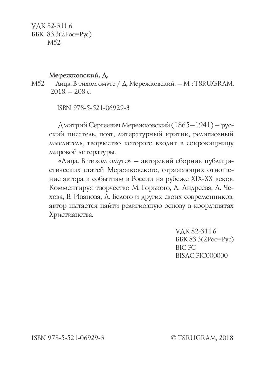 Дмитрий Сергеевич Мережковский (1865-1941) - русский писатель, поэт, литературный критик, религиозный мыслитель, творчество которого входит в сокровищницу мировой литературы. «Лица. В тихом омуте» - авторский сборник публицистических статей Мережковского, отражающих отношение автора к событиям в России на рубеже XIX-XX веков. Комментируя творчество М. Горького, Л. Андреева, А. Чехова, В. Иванова, А. Белого и других своих современников, автор пытается найти религиозную основу в координатах Христианства| Издательство | Т8 RUGRAM |