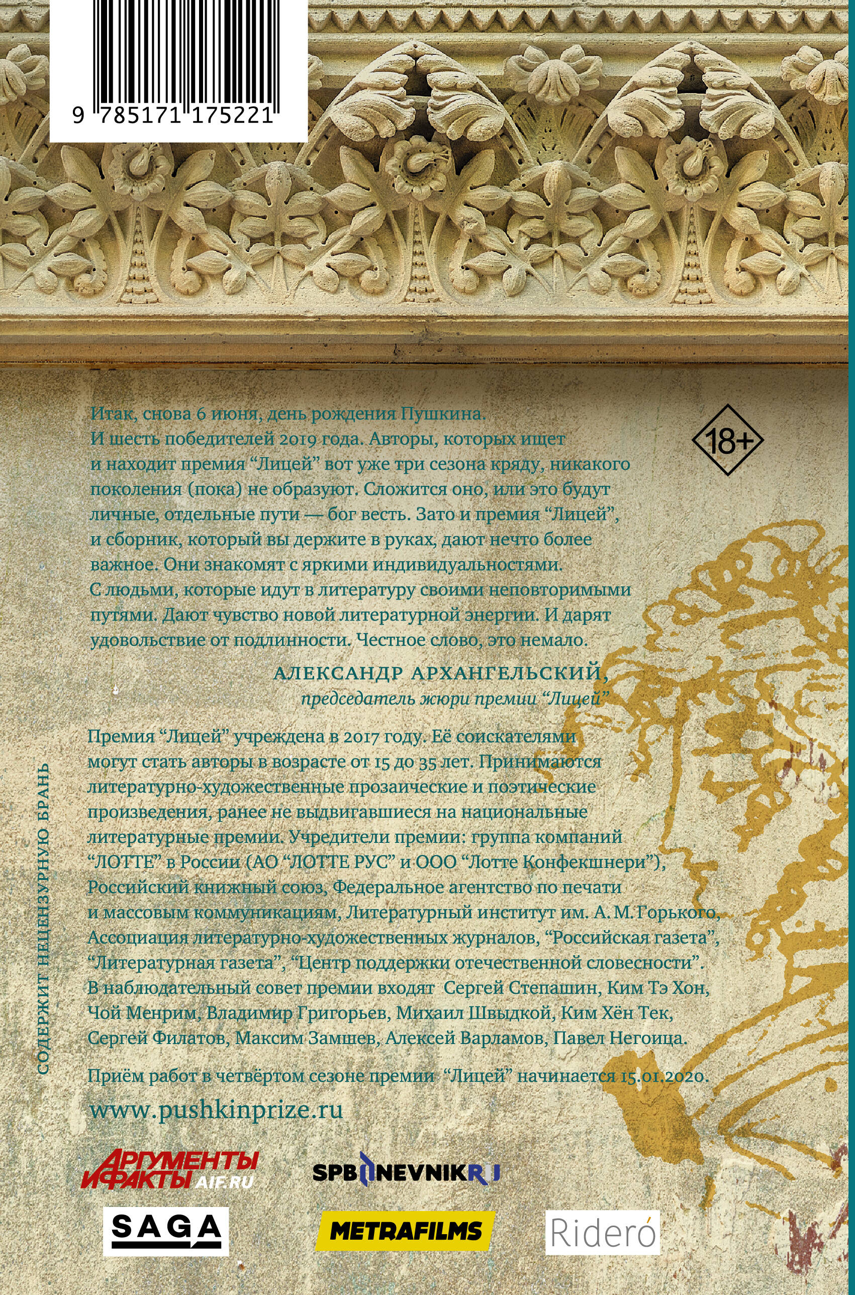 И снова 6 июня, в день рождения Пушкина, на главной сцене Литературного фестиваля на Красной площади были объявлены шесть лауреатов премии "Лицей". В книгу включены тексты победителей - прозаиков Павла Пономарёва, Никиты Немцева, Анастасии Разумовой и поэтов Оксаны Васякиной, Александры Шалашовой, Антона Азаренкова.| Издательство | ИЗДАТЕЛЬСТВО "АСТ" |
