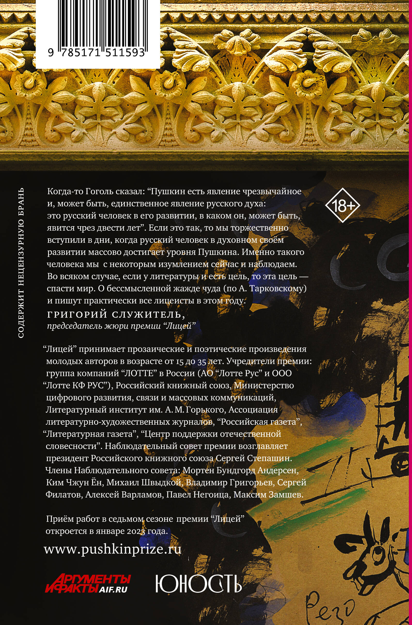 Литературная премия для молодых авторов «Лицей» вручается с 2017 года. За это время было открыто множество новых имён. Тексты финалистов и лауреатов были изданы в лучших издательствах страны. На соискание премии «Лицей» в 2022 году было прислано 2 139 работ со всех уголков России, возраст участников от 20 до 35 лет. В сборник вошли тексты шести лучших из них. В сборник «Лицей 2022. Шестой выпуск» вошли тексты победителей 2022 года - прозаиков Екатерины Манойло, Михаила Турбина, Алексея Колесникова и поэтов Оли Скорлупкиной, Дениса Балина, Антона Азаренкова. Будущее актуальной российской литературы формируется здесь и сейчас: этот сборник - современность глазами молодых. «Если можно было бы выделить одну общую для всех авторов тему, то, думаю, этой темой стало бы оживление, реанимация (как физическая, так и метафизическая) или даже воскресение». Григорий Служитель, председатель жюри.