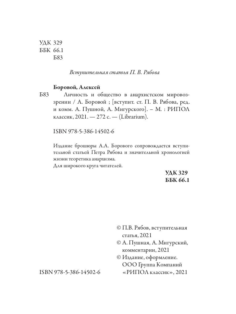 Издание брошюры А.А. Борового сопровождается вступительной статьей Петра Рябова и значительной хронологией жизни теоретика анархизма. Для широкого круга читателей.