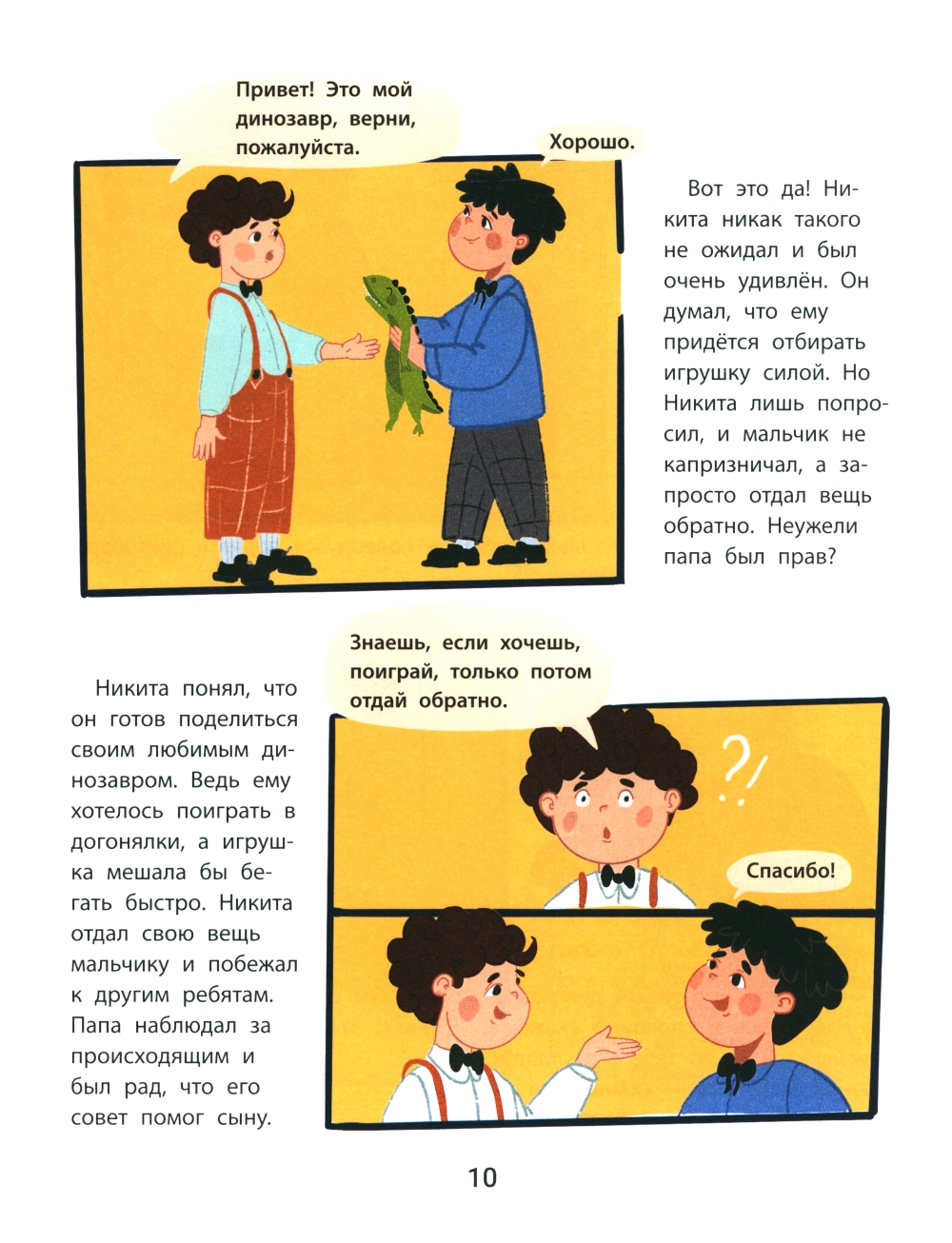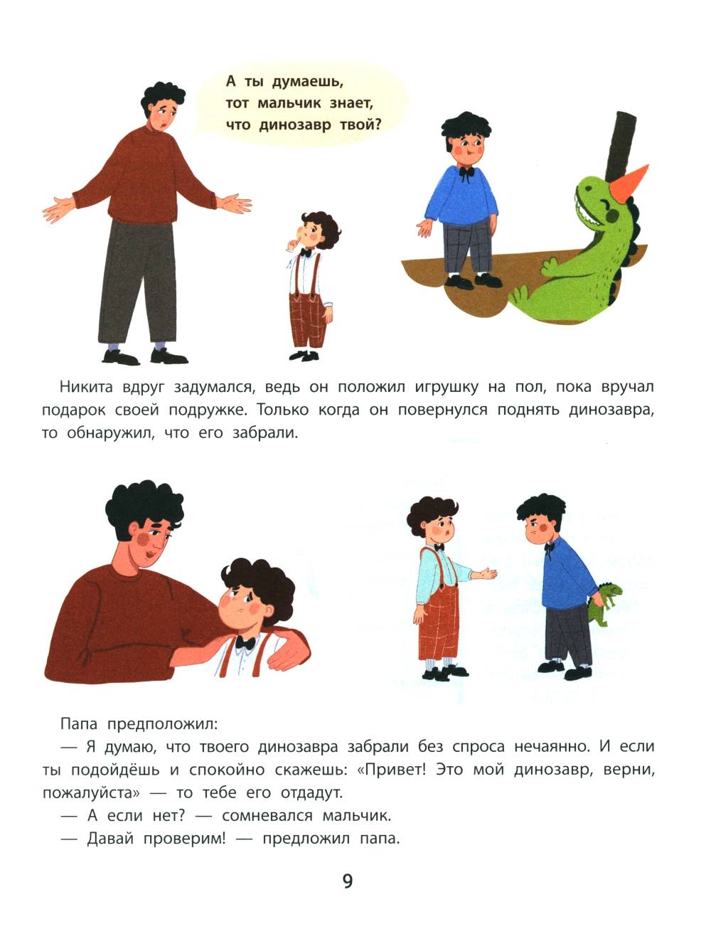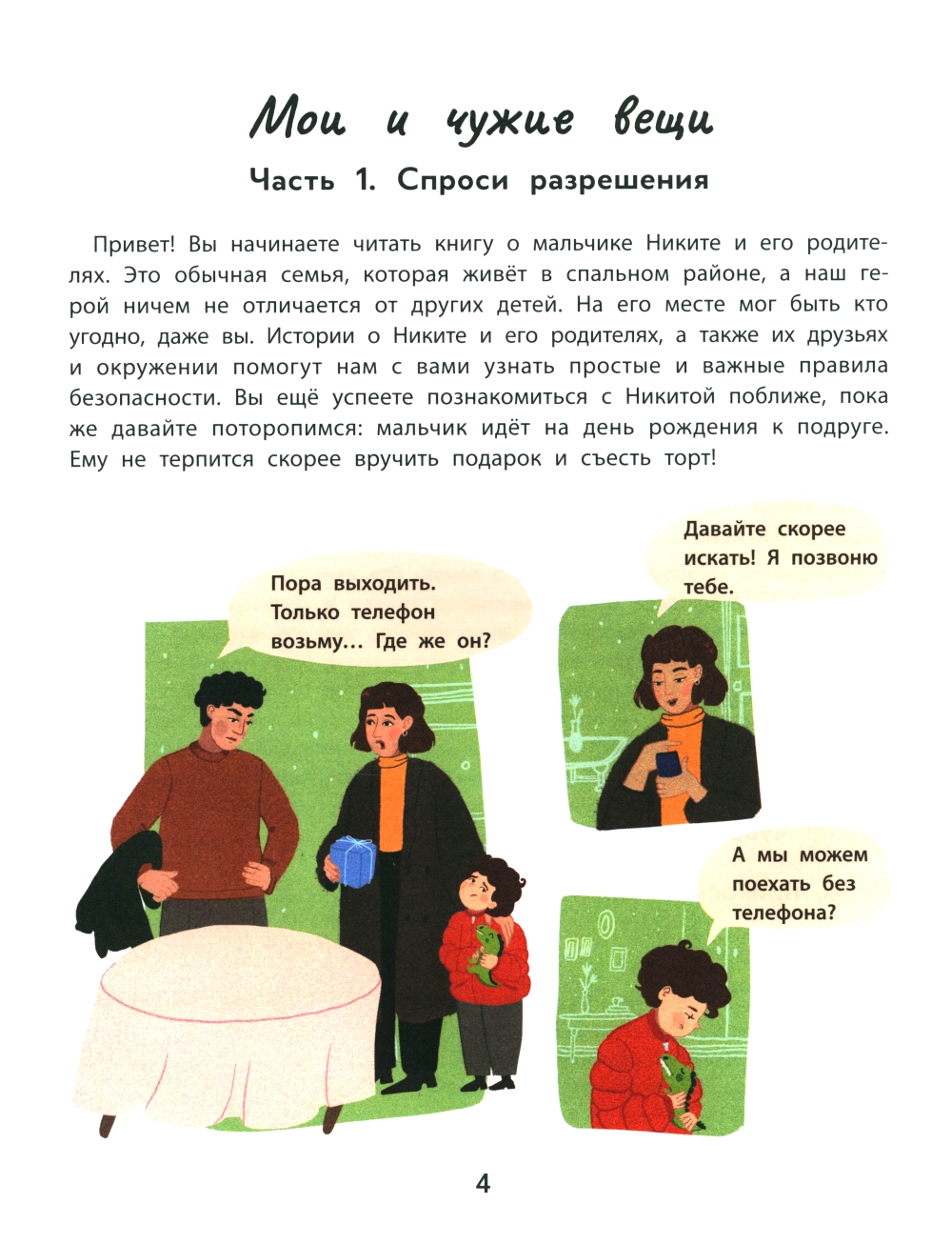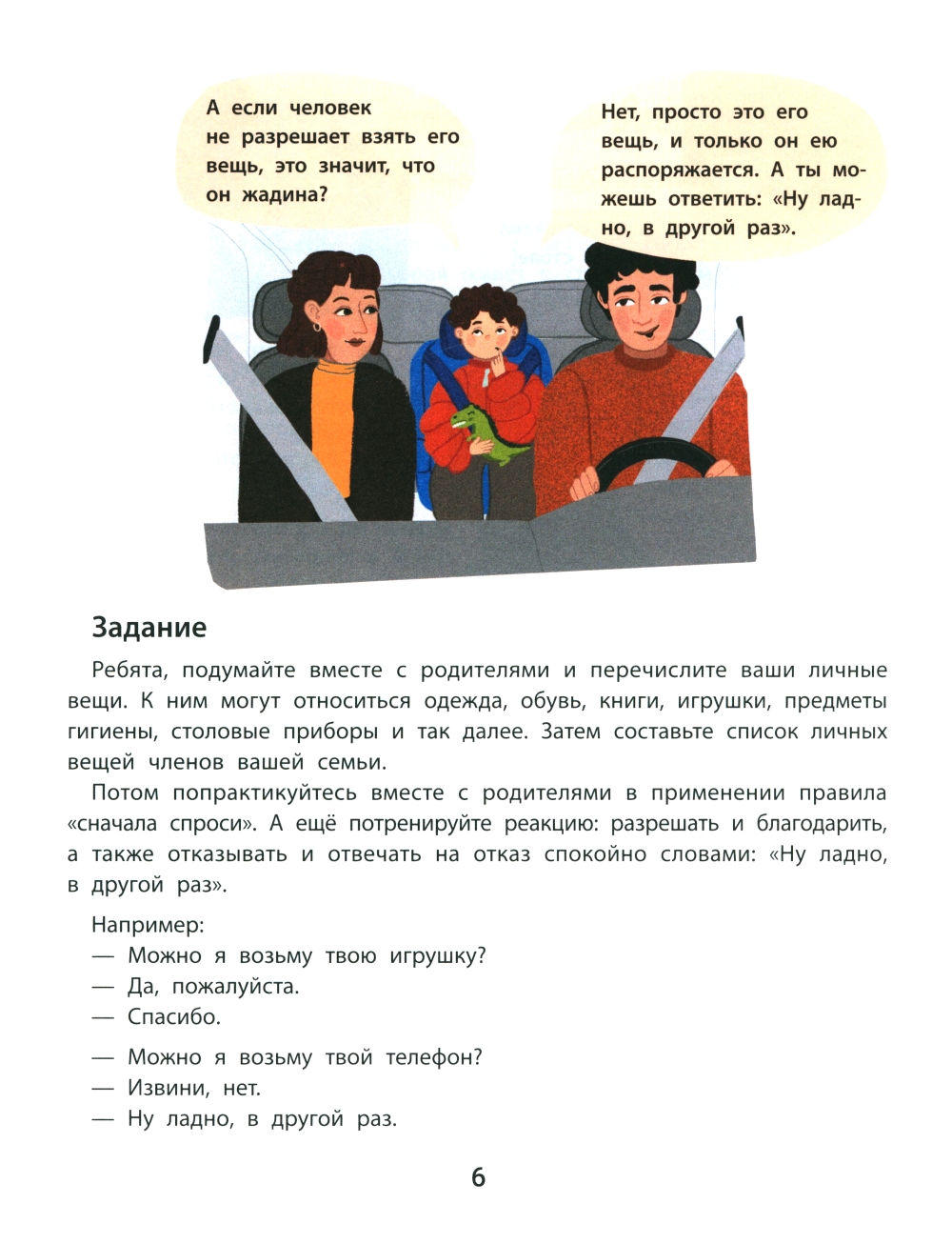 Эта книга, созданная для чтения с детьми, заинтересует их множеством цветных картинок и научит правилам личной безопасности. Как быть, если любимую игрушку ребёнка взяли без спроса? Почему важно правило «твоё тело - твоё дело» и означает ли оно, что можно не чистить зубы? Об этом и многом другом расскажут увлекательные истории, а закрепить знания помогут интересные задания от автора - клинического психолога и создателя Академии безопасности Ольги Бочковой. Её книги о жизни обычного мальчика Никиты уже полюбились более чем ста тысячам ребят.| Издательство | Феникс |